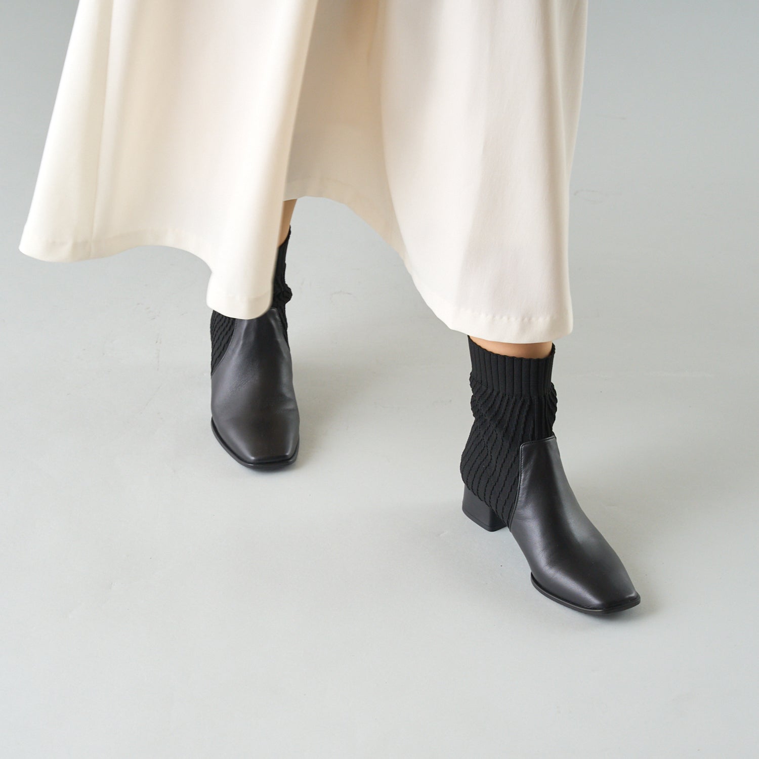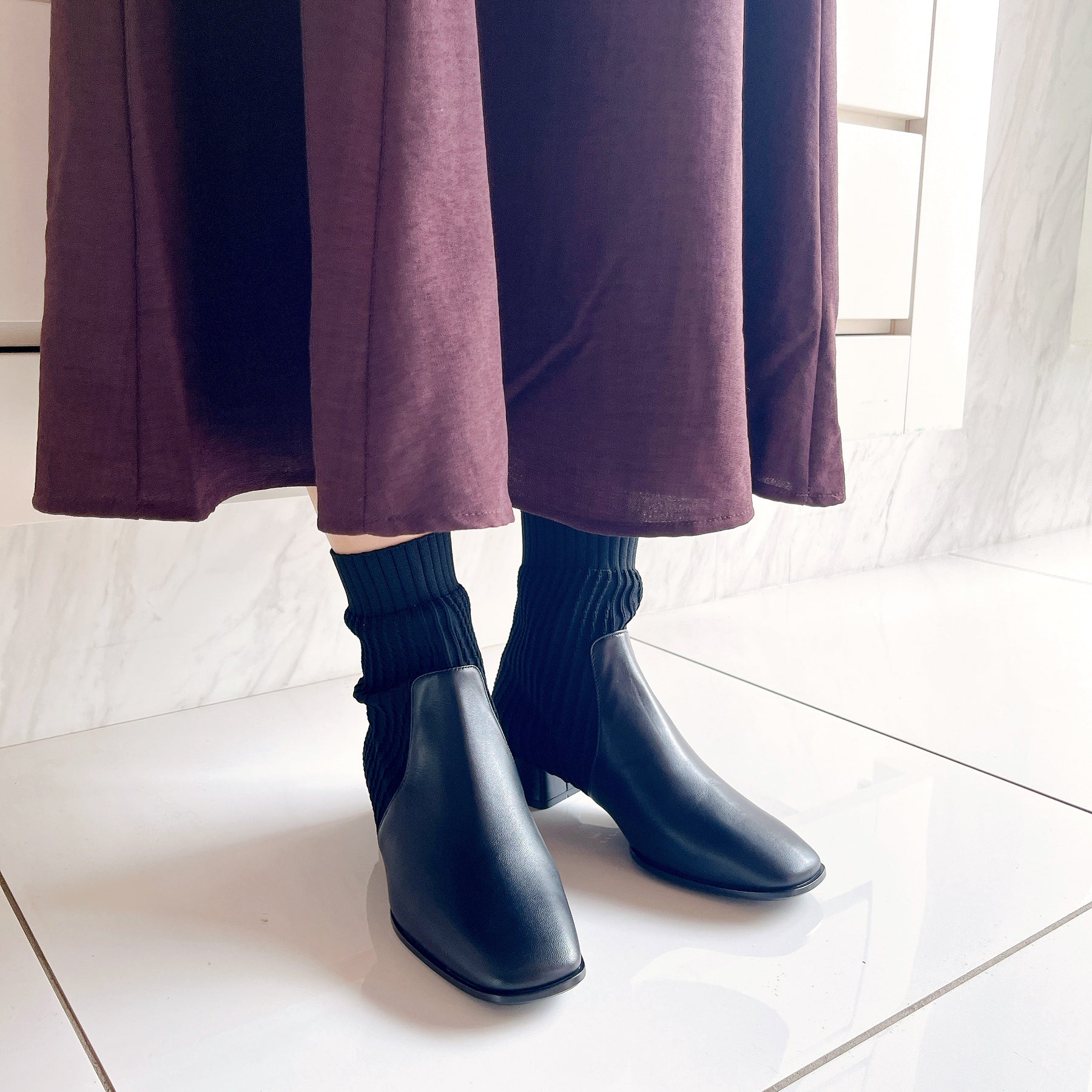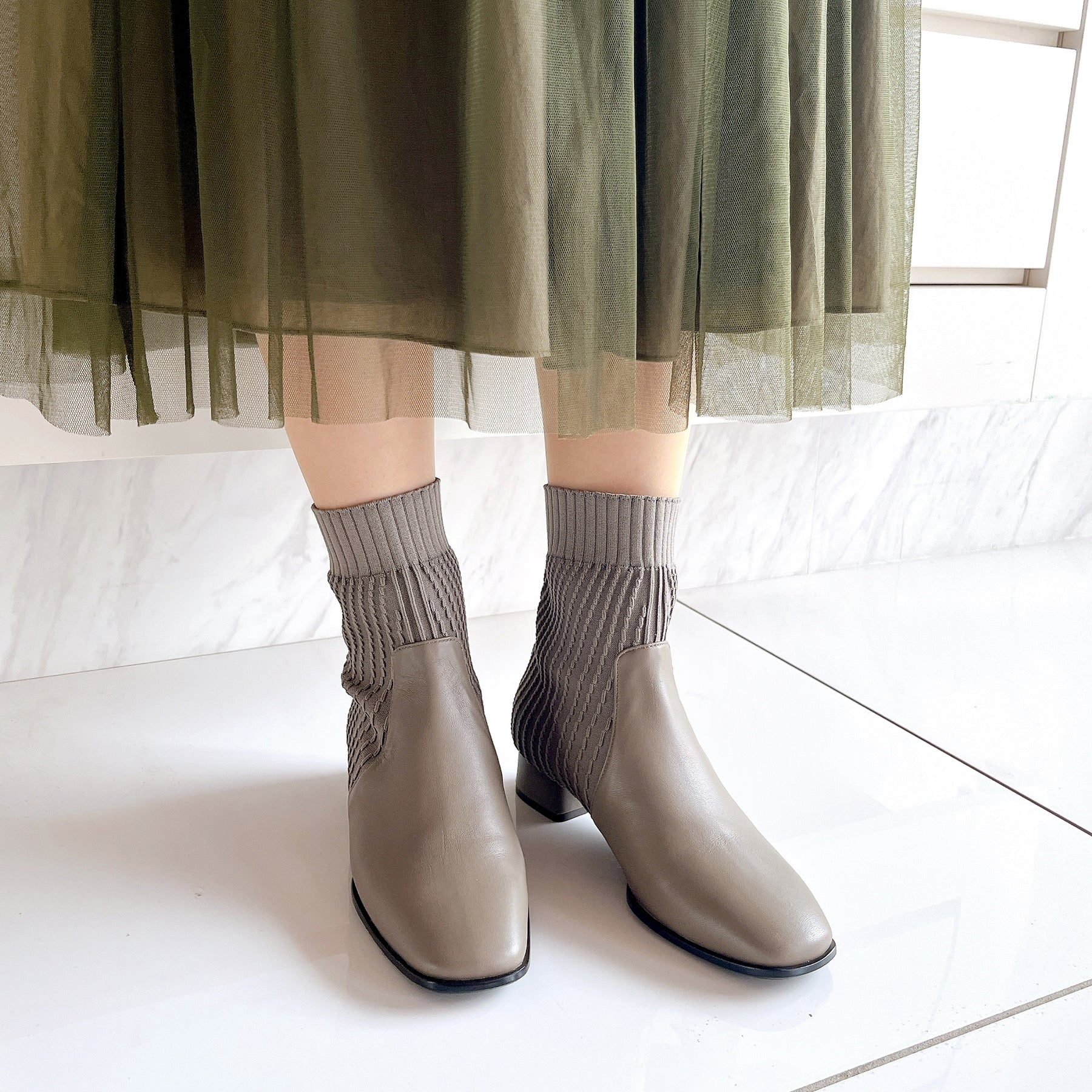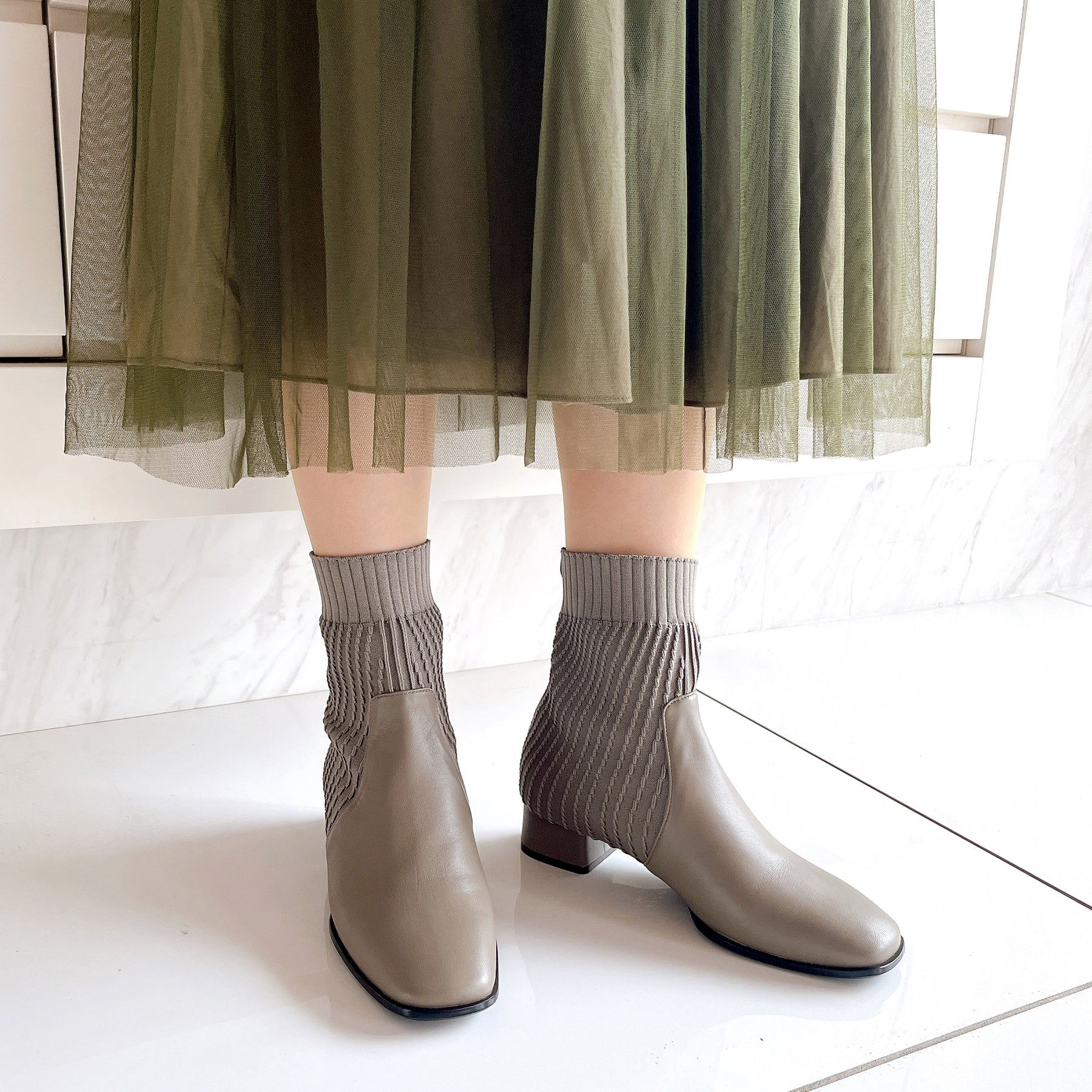 同色のニットとレザーのコンビがポイントのショートブーツ。柔らかいストレッチニットと安定感のある3.5㎝ヒールで歩きやすさも抜群!甲裏には抗菌防臭機能付きのクッションが内蔵されていてソフトな履き心地です。