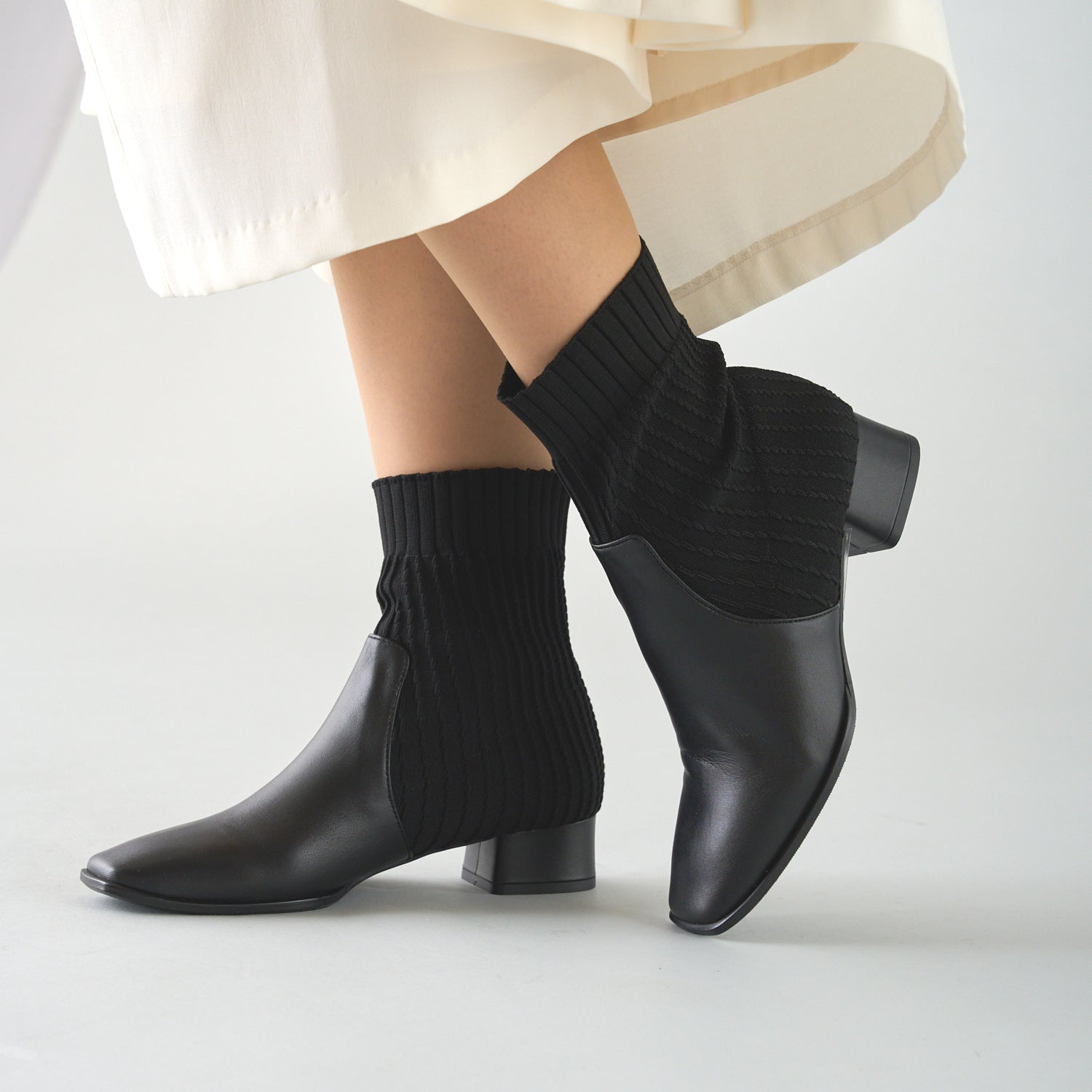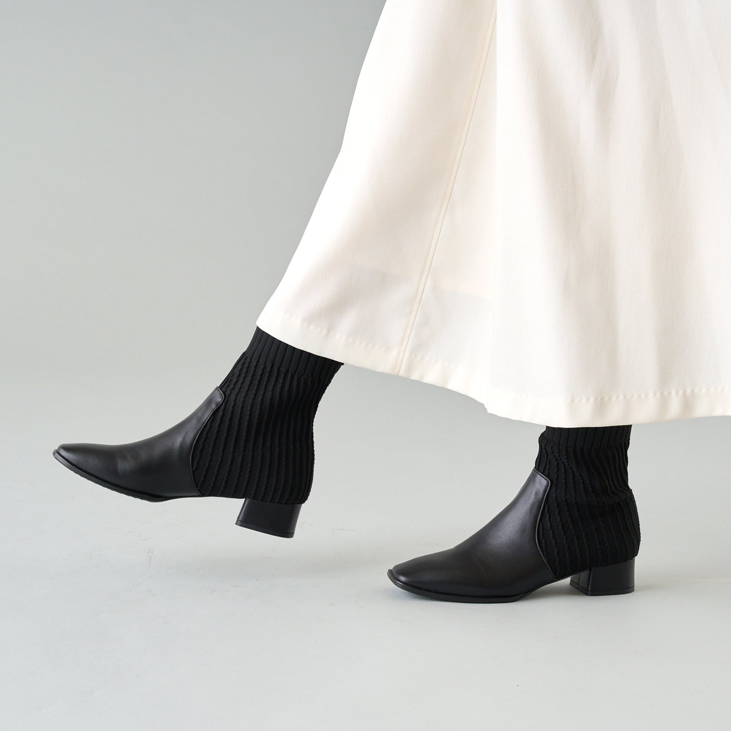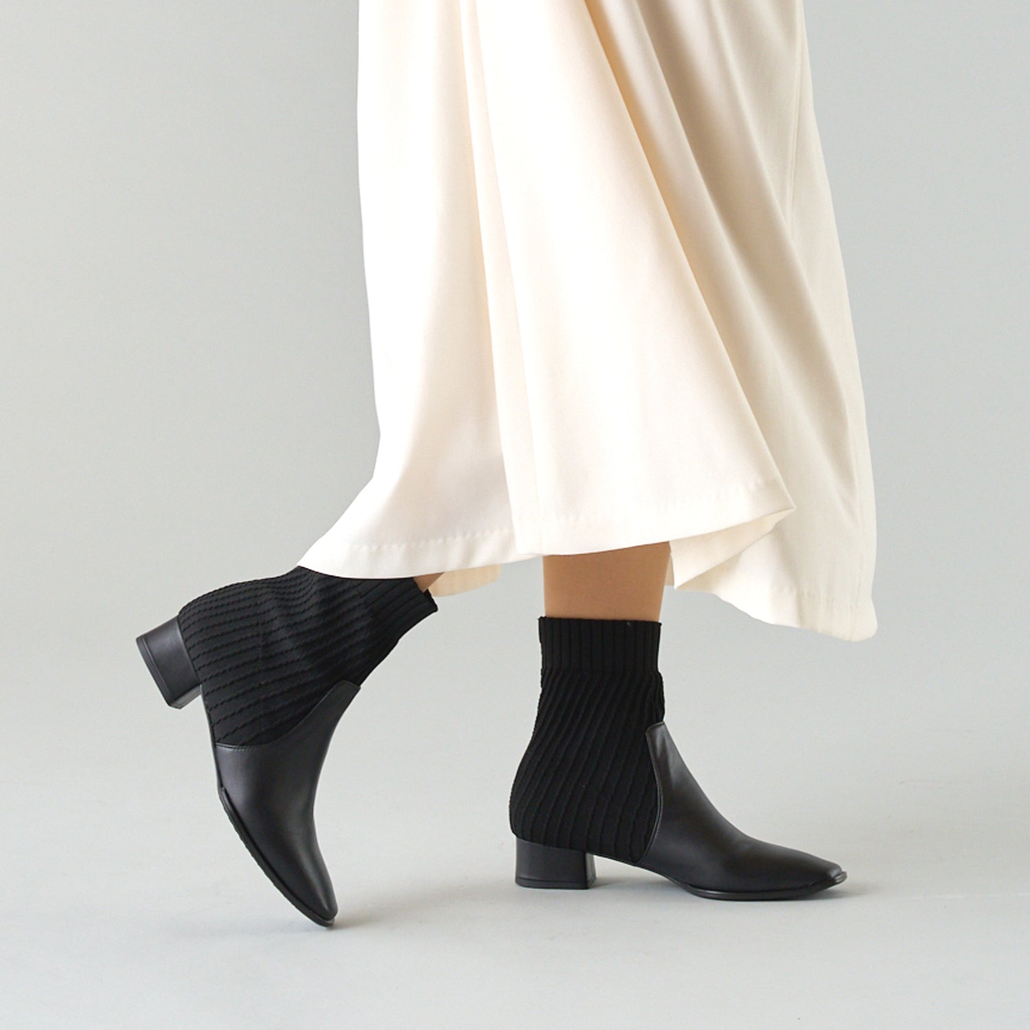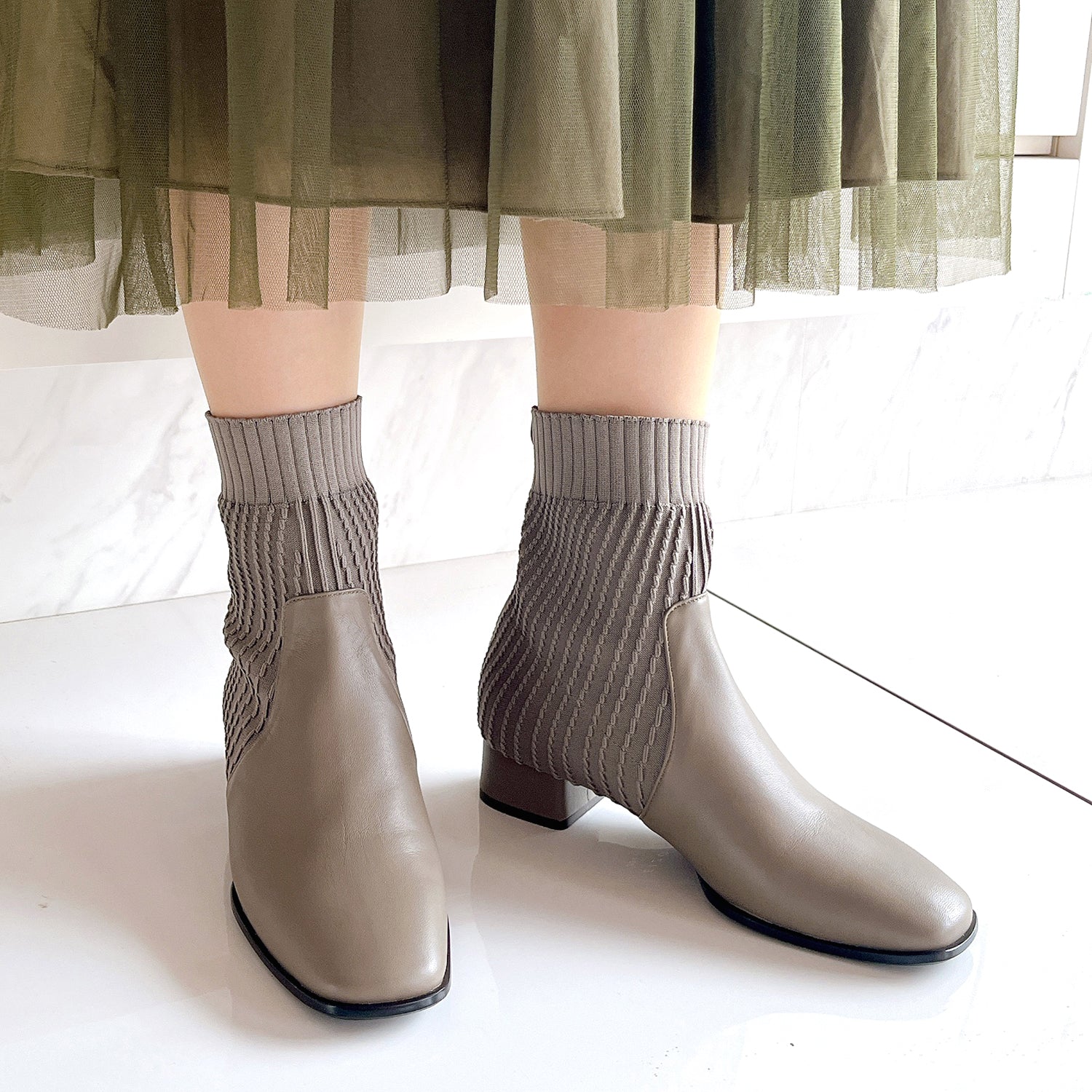 同色のニットとレザーのコンビがポイントのショートブーツ。柔らかいストレッチニットと安定感のある3.5㎝ヒールで歩きやすさも抜群!甲裏には抗菌防臭機能付きのクッションが内蔵されていてソフトな履き心地です。