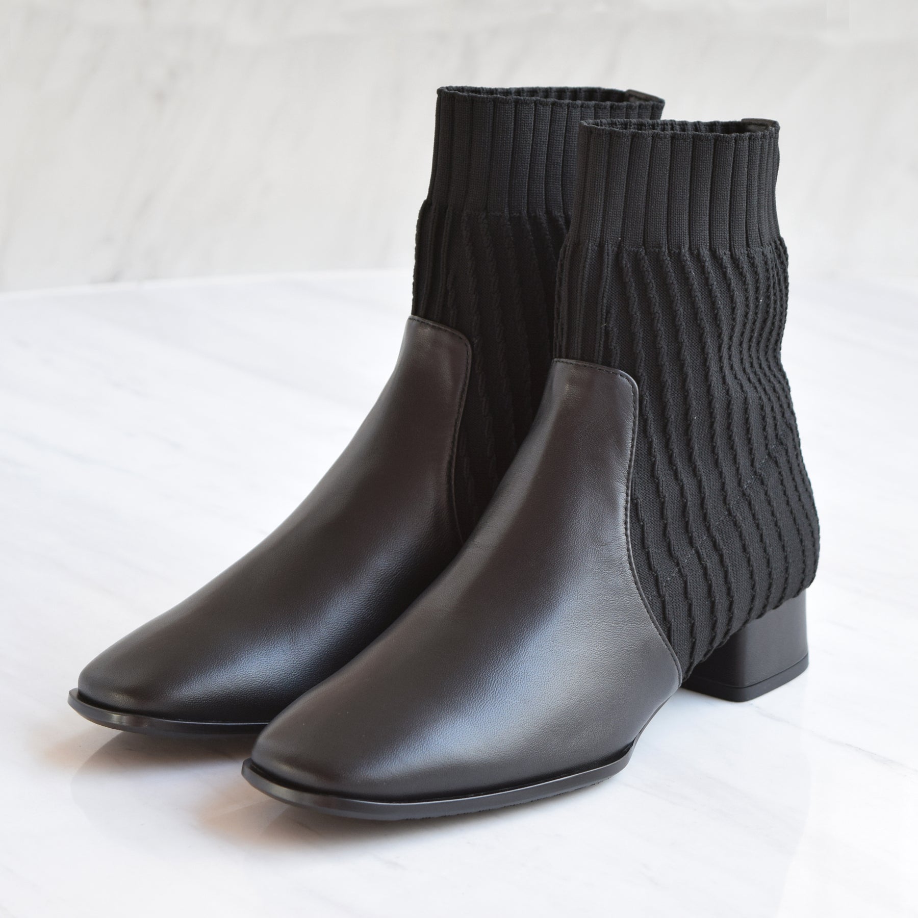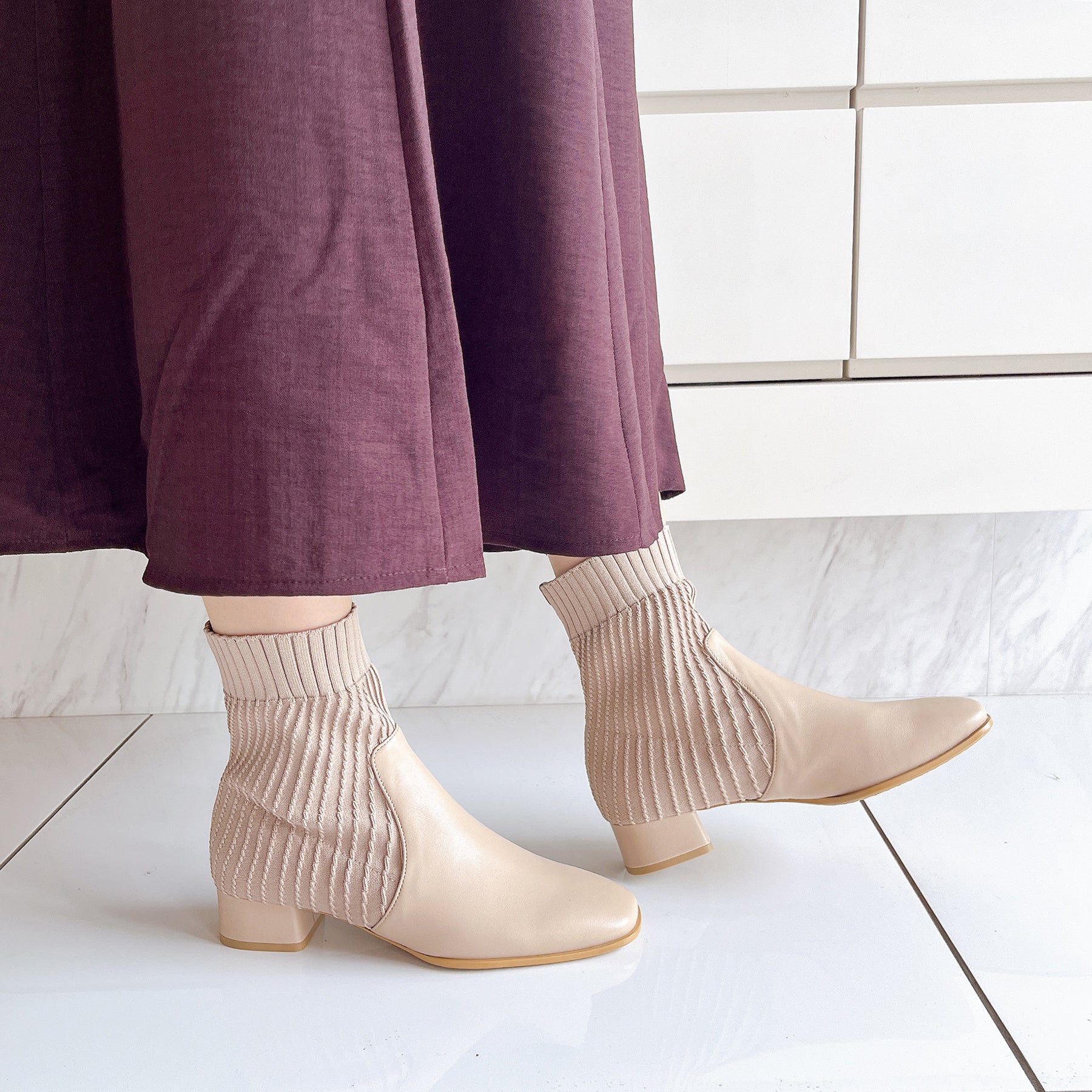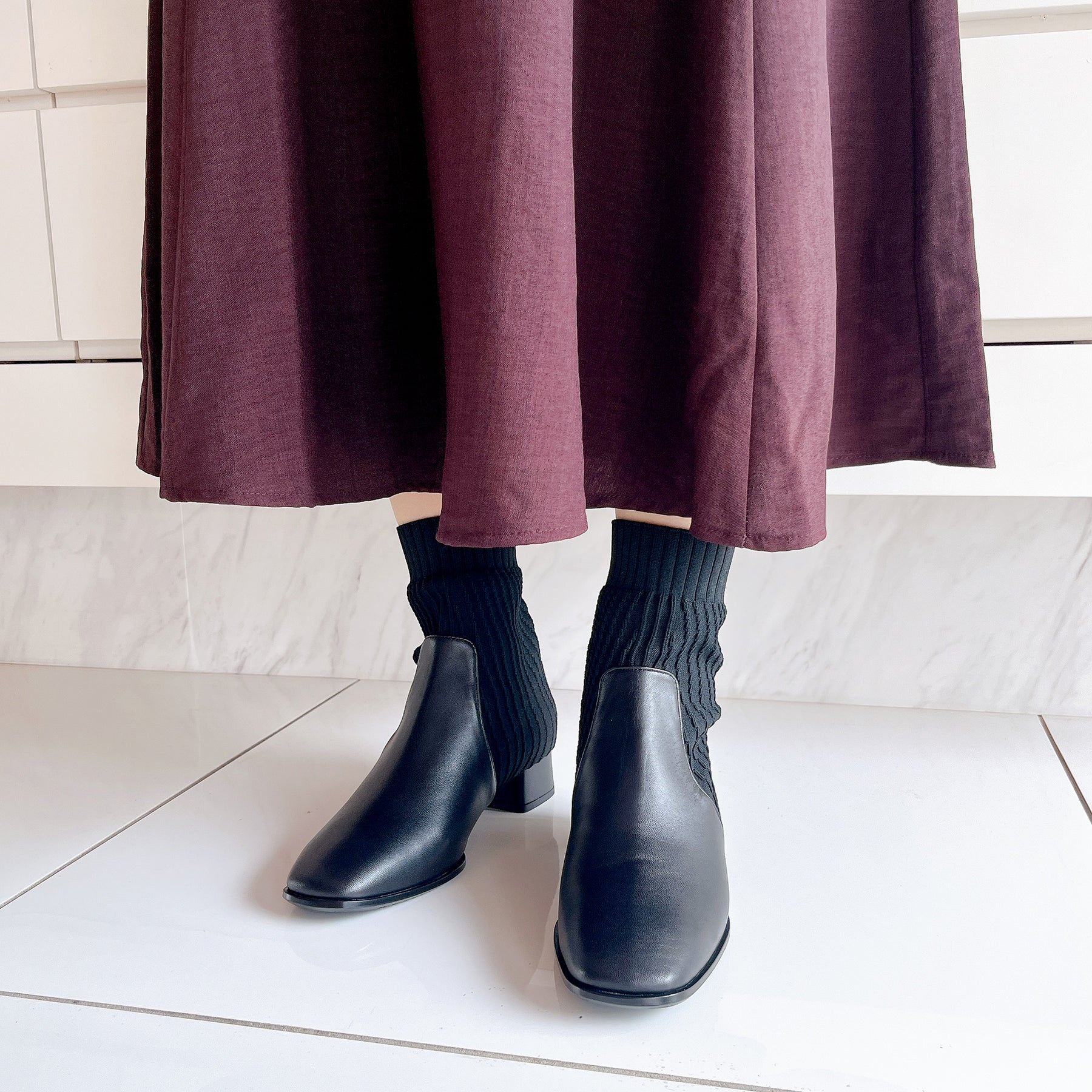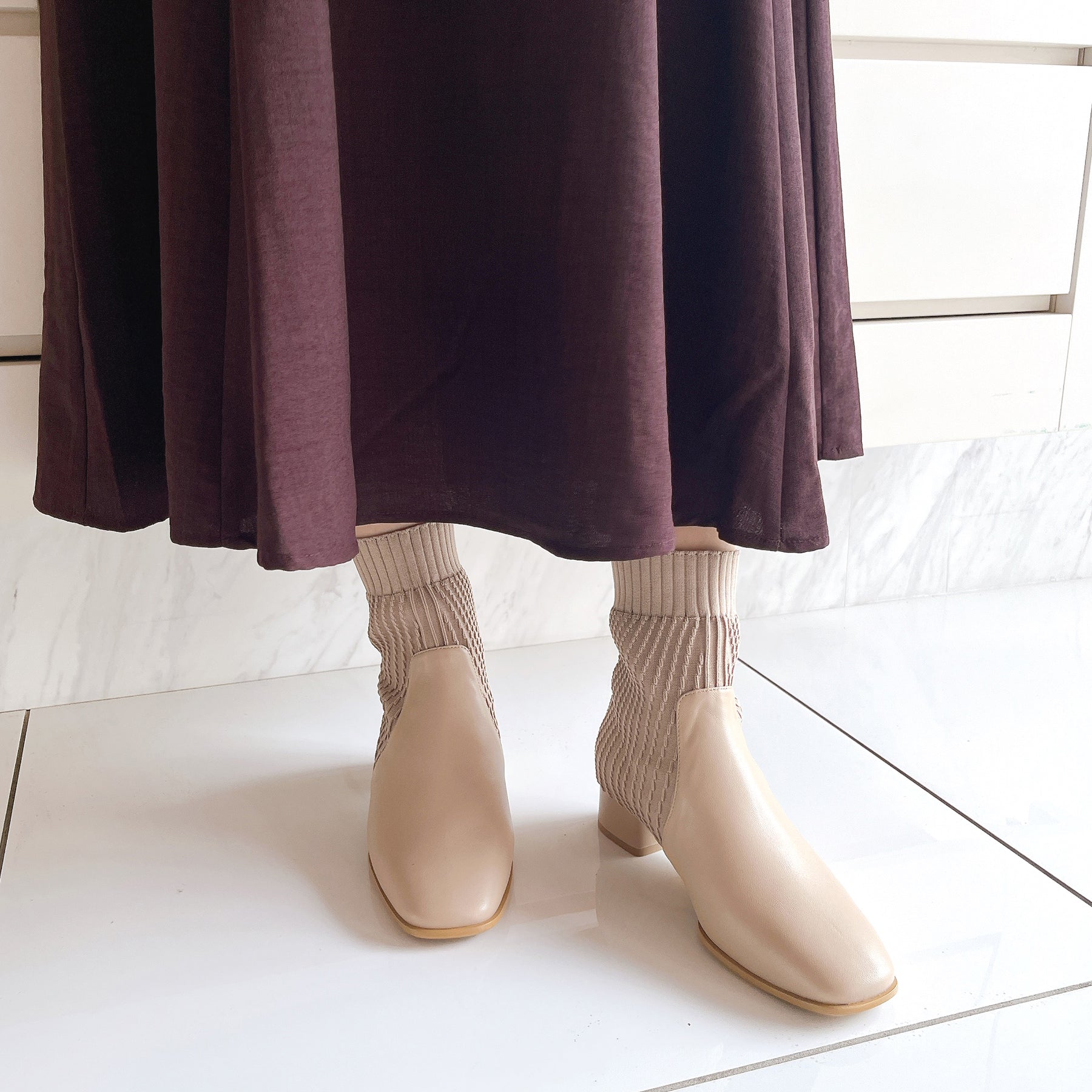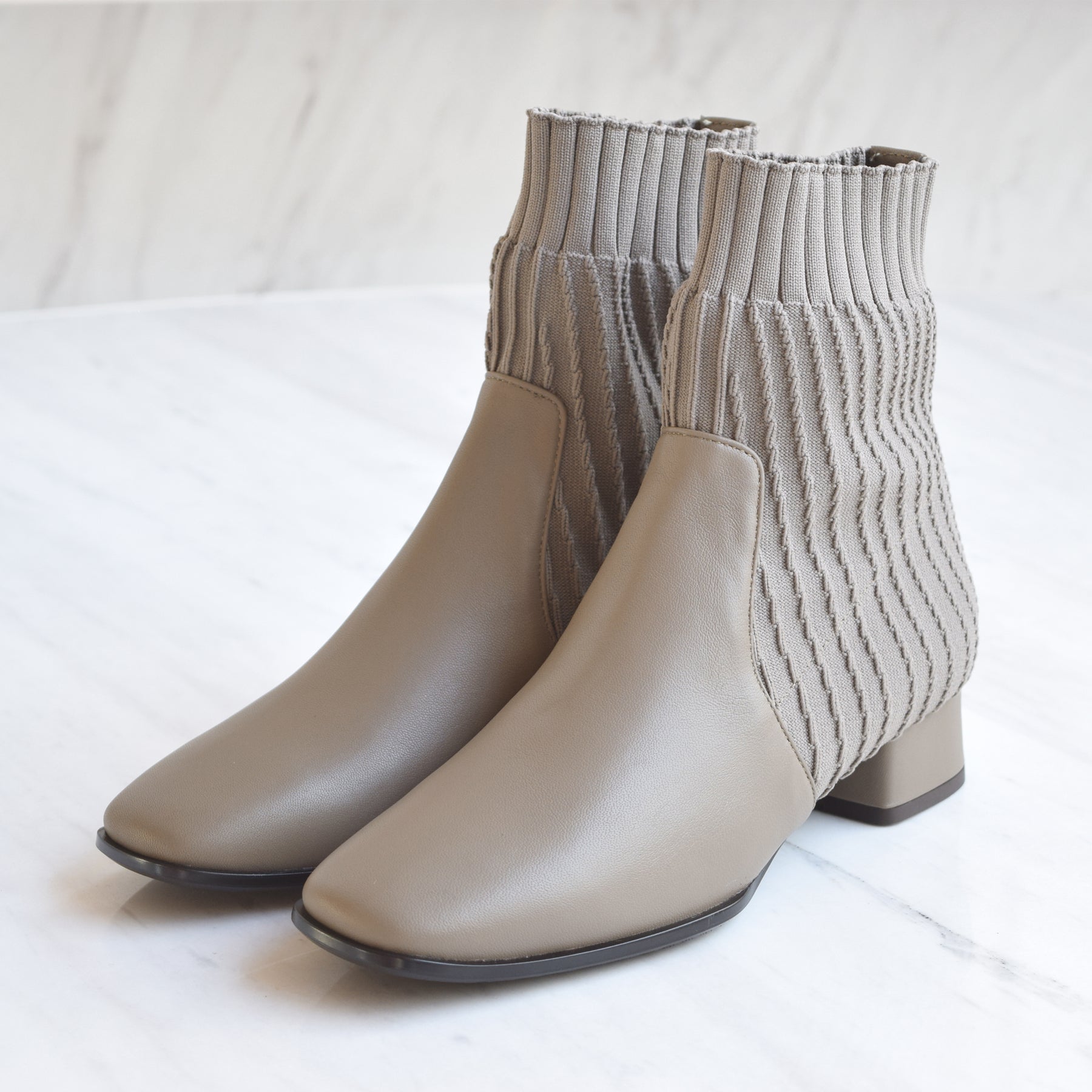 同色のニットとレザーのコンビがポイントのショートブーツ。柔らかいストレッチニットと安定感のある3.5㎝ヒールで歩きやすさも抜群!甲裏には抗菌防臭機能付きのクッションが内蔵されていてソフトな履き心地です。