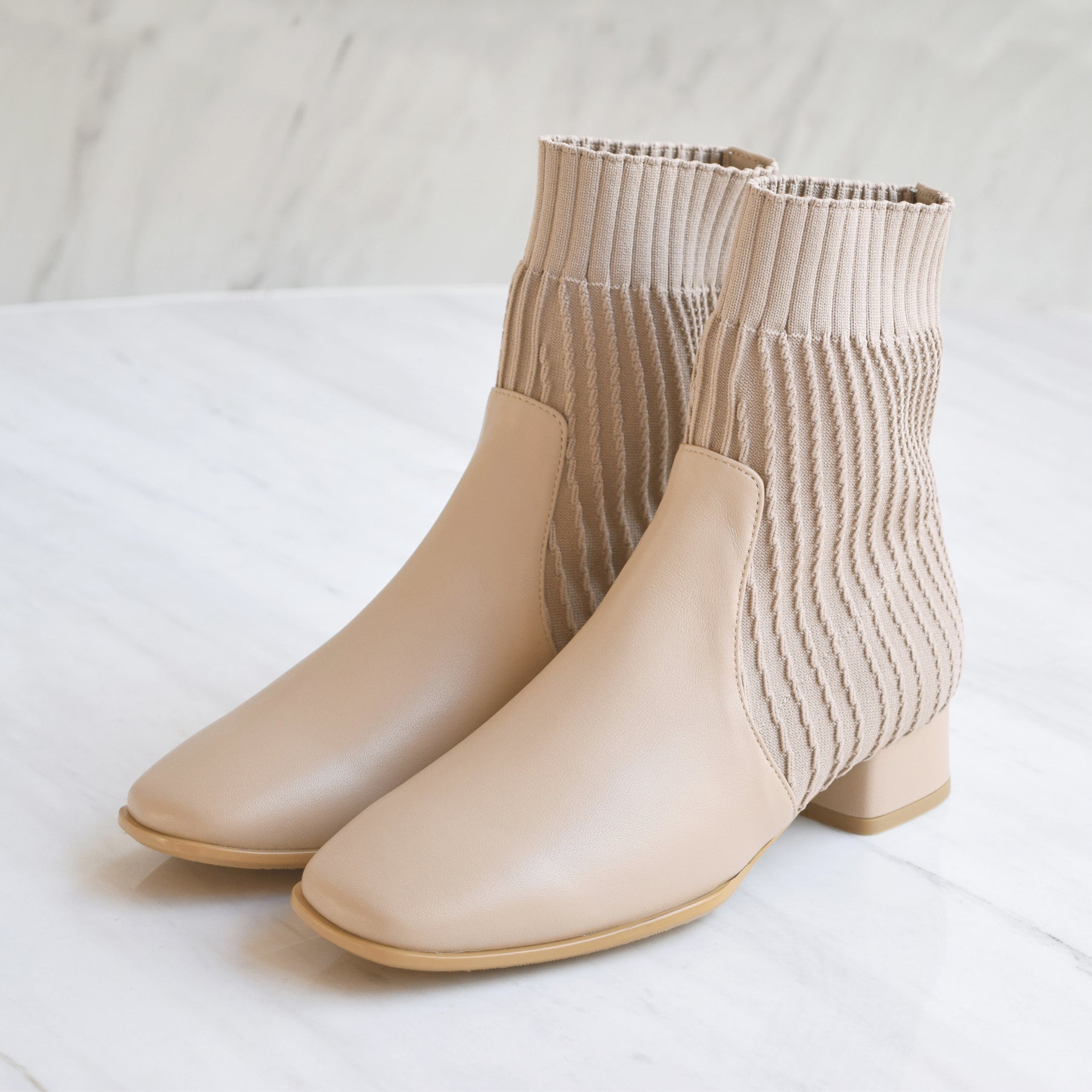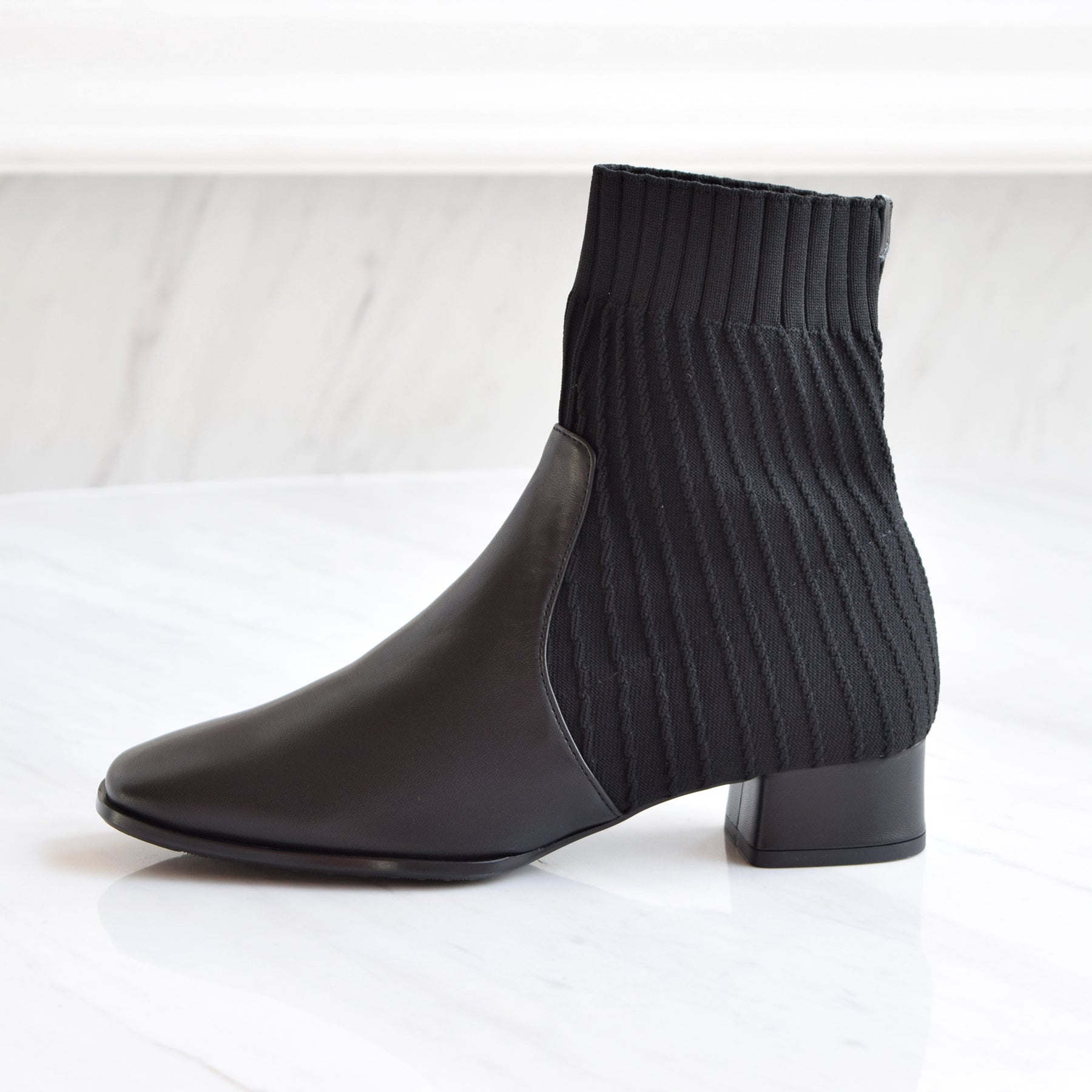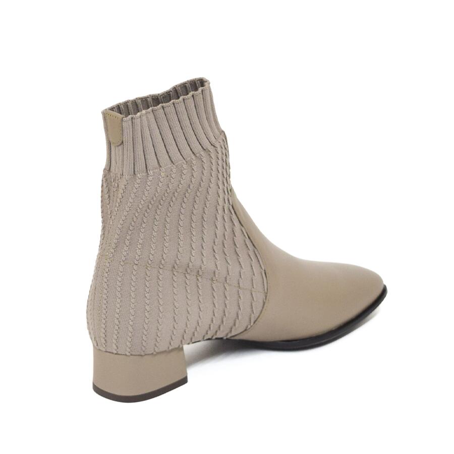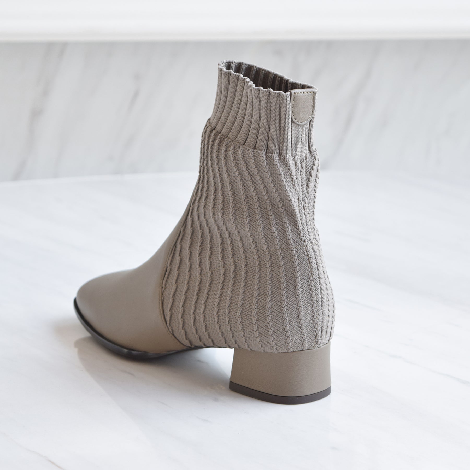 同色のニットとレザーのコンビがポイントのショートブーツ。柔らかいストレッチニットと安定感のある3.5㎝ヒールで歩きやすさも抜群!甲裏には抗菌防臭機能付きのクッションが内蔵されていてソフトな履き心地です。