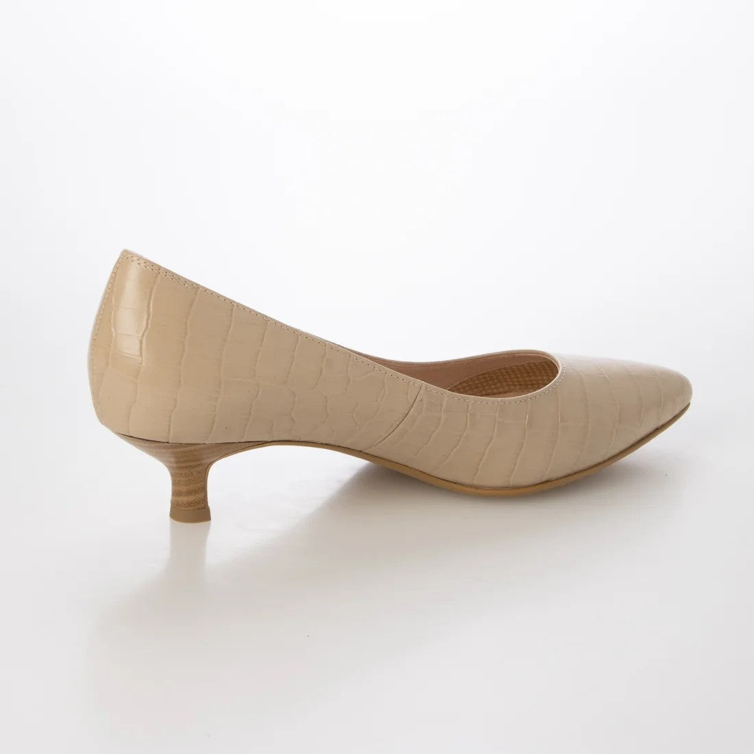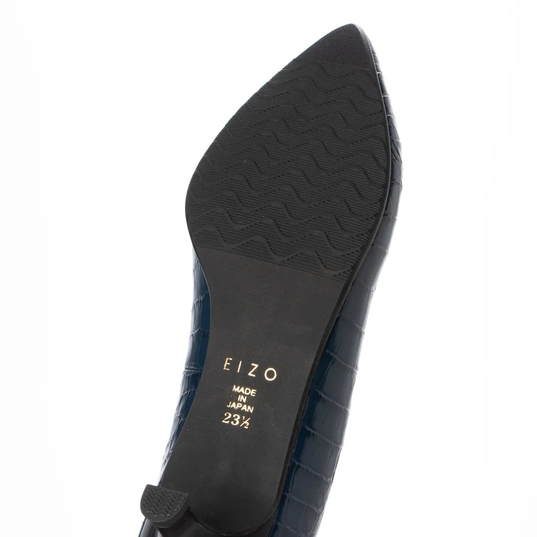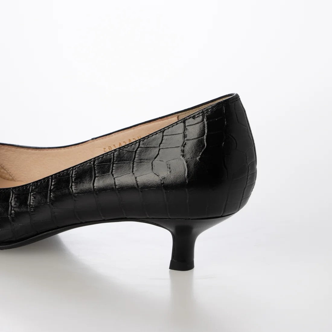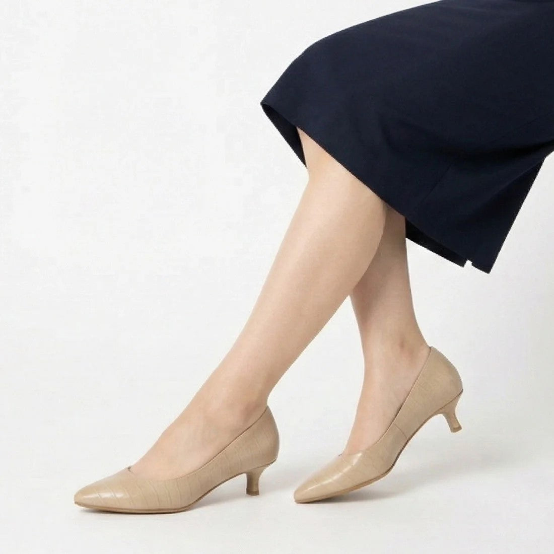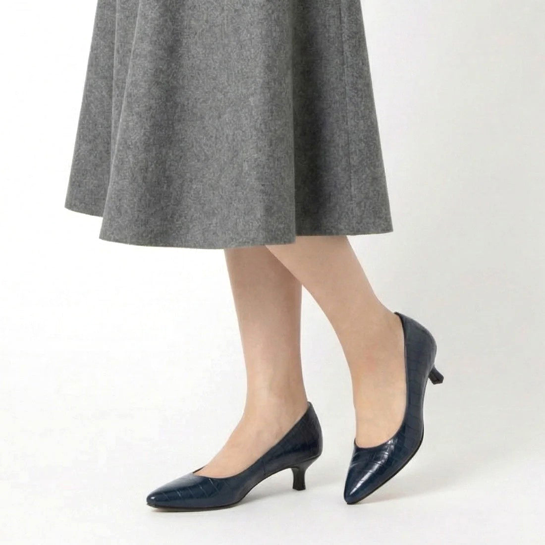 程良い4cmヒールのプレーンパンプス。クールな印象の型押しレザーは防水加工になっていて通勤にもぴったりです。
