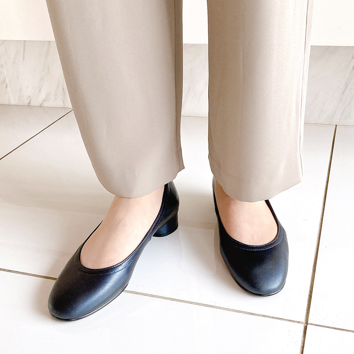 ソフトレザーのプレーンパンプス。足あたりも良く、3cmヒールで安定感も抜群。