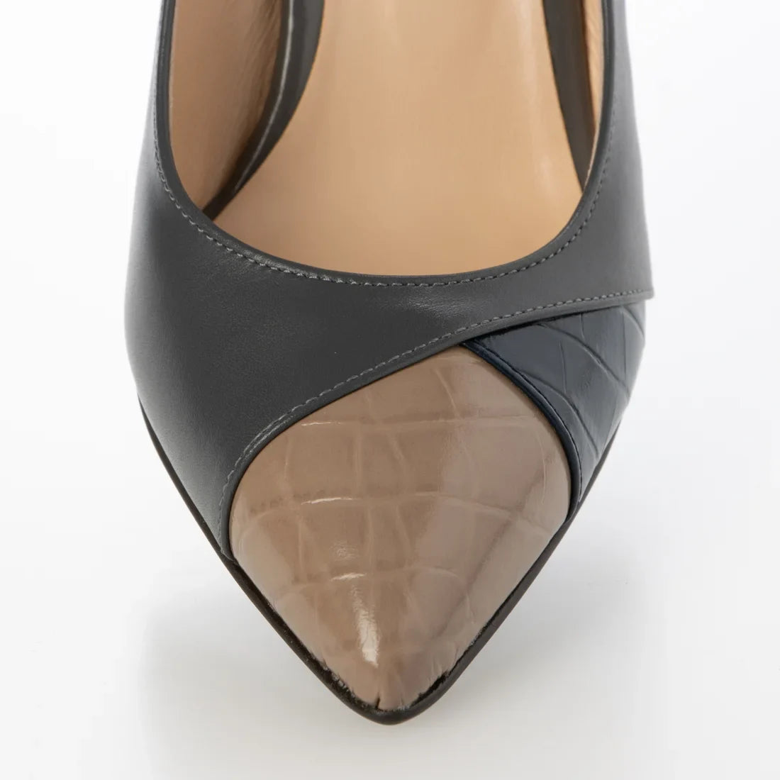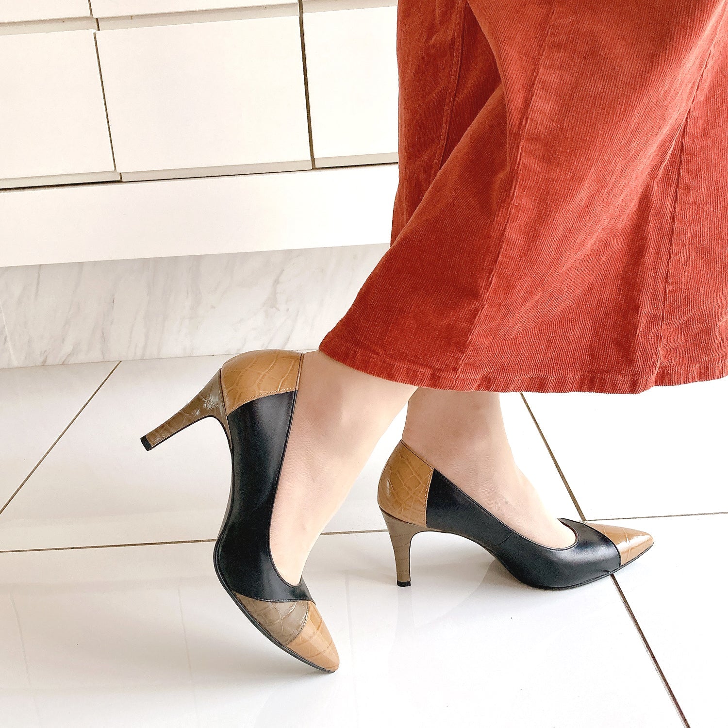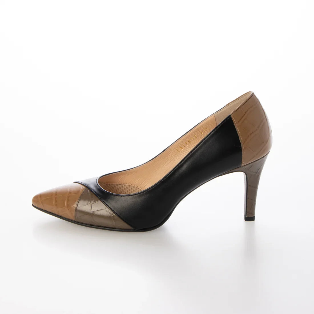 クロコダイルの型押しレザーがポイントのデザインパンプス。