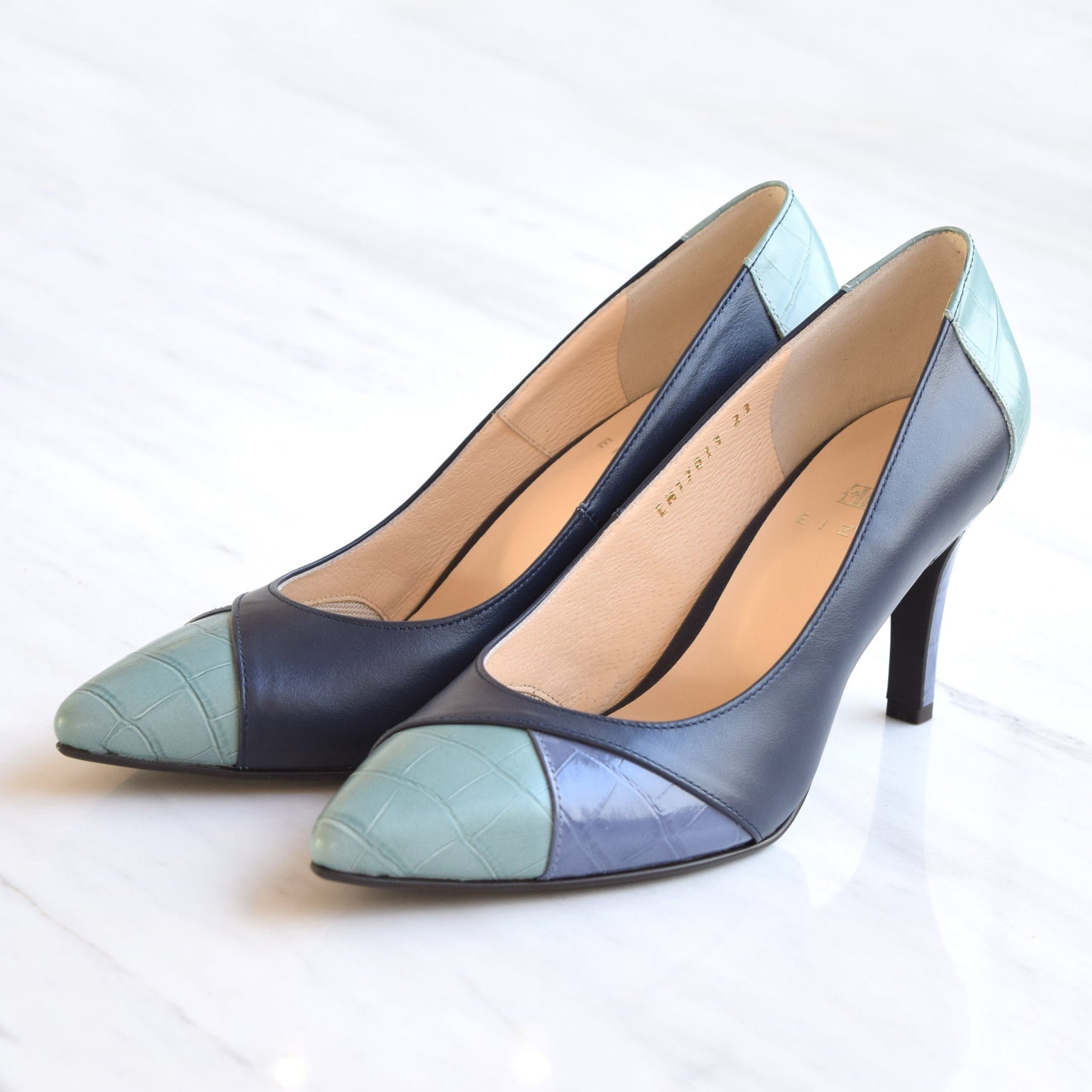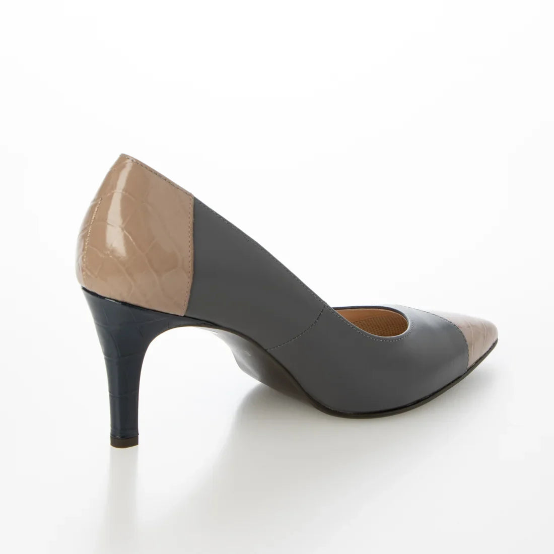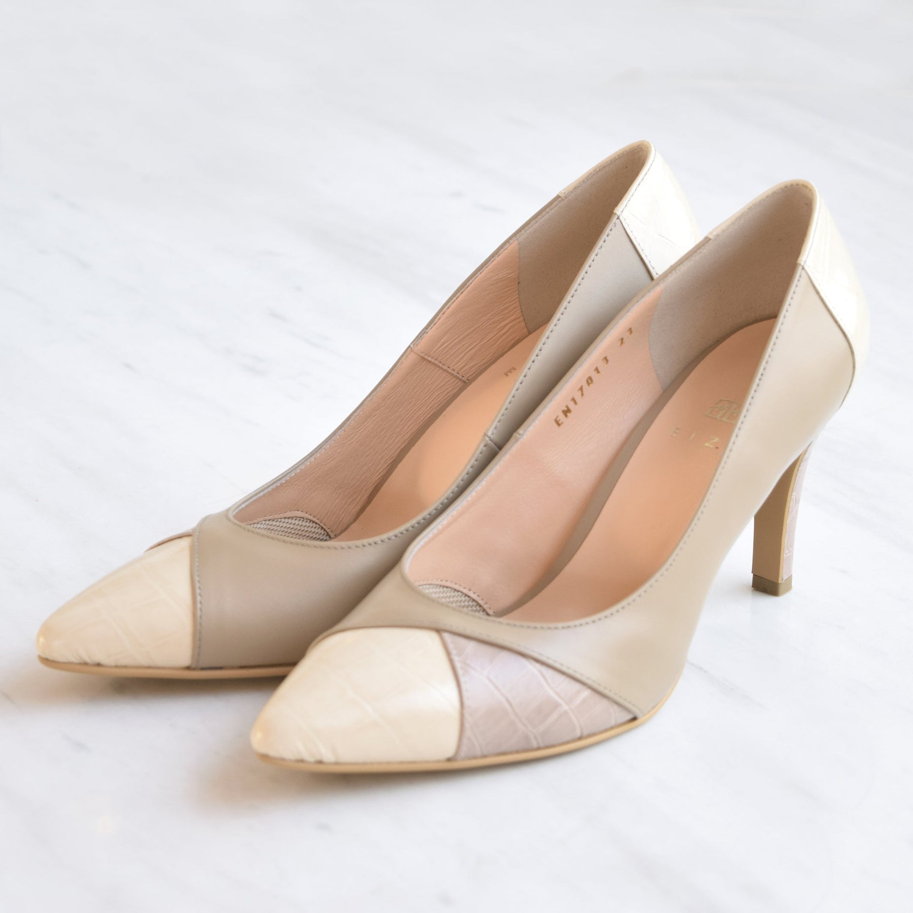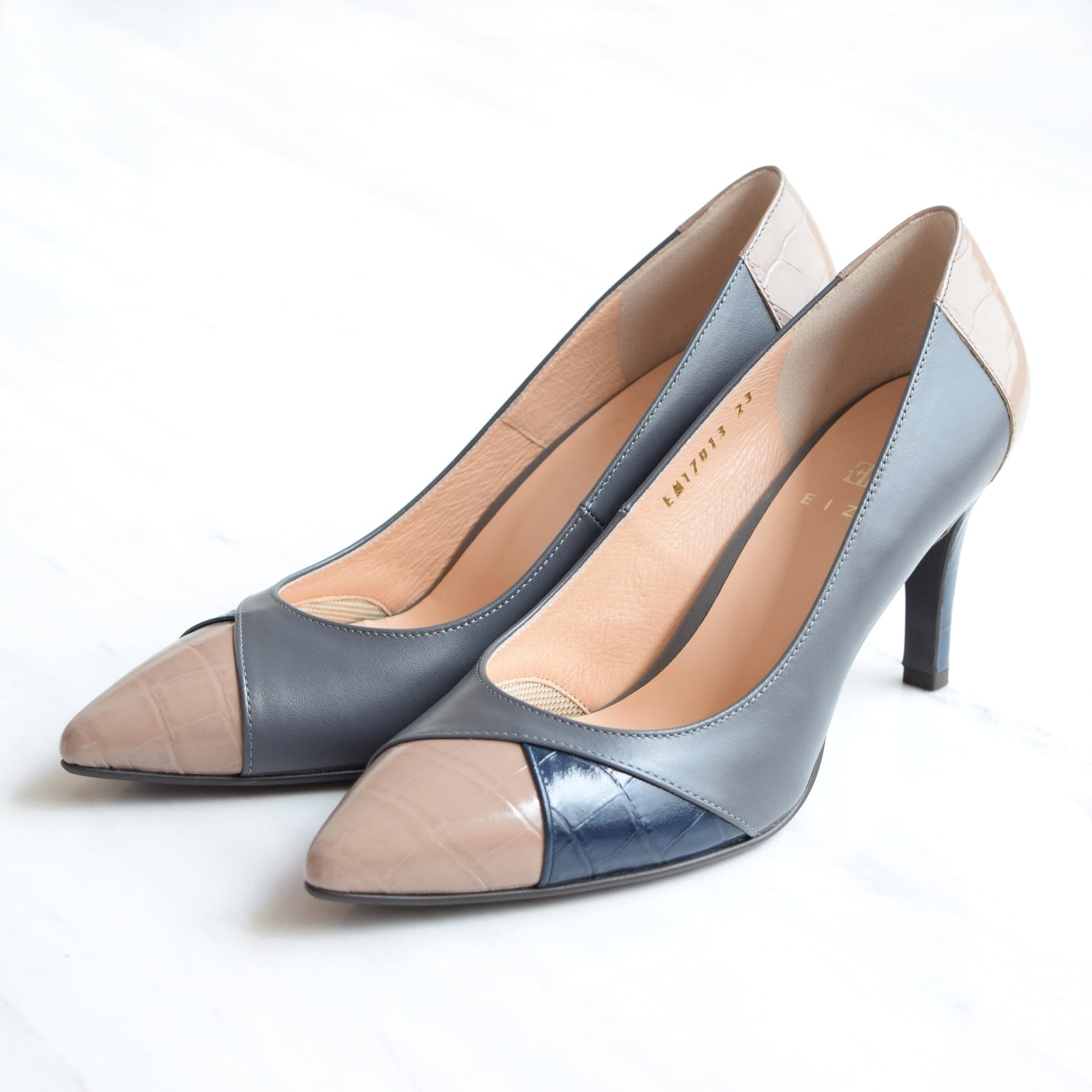 クロコダイルの型押しレザーがポイントのデザインパンプス。