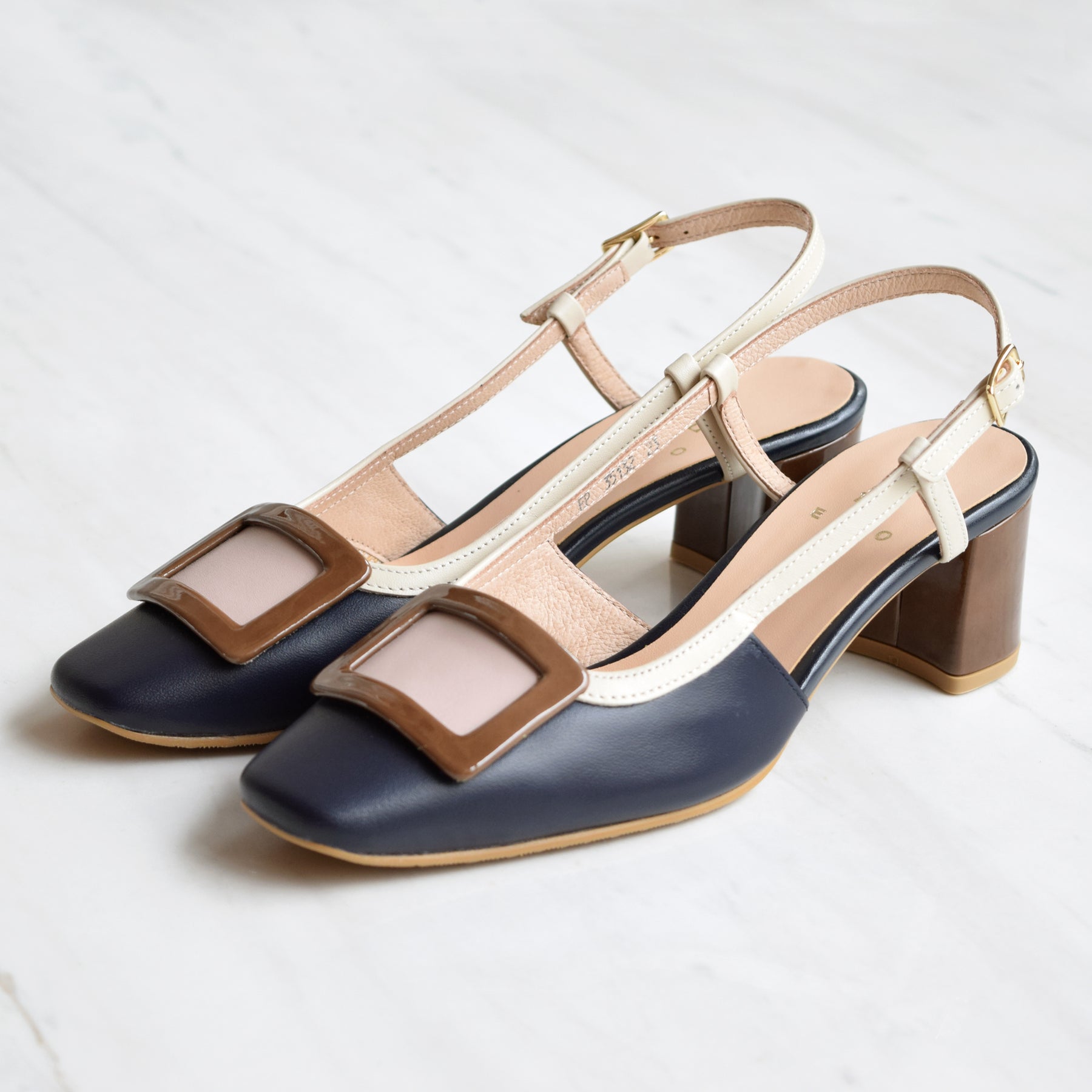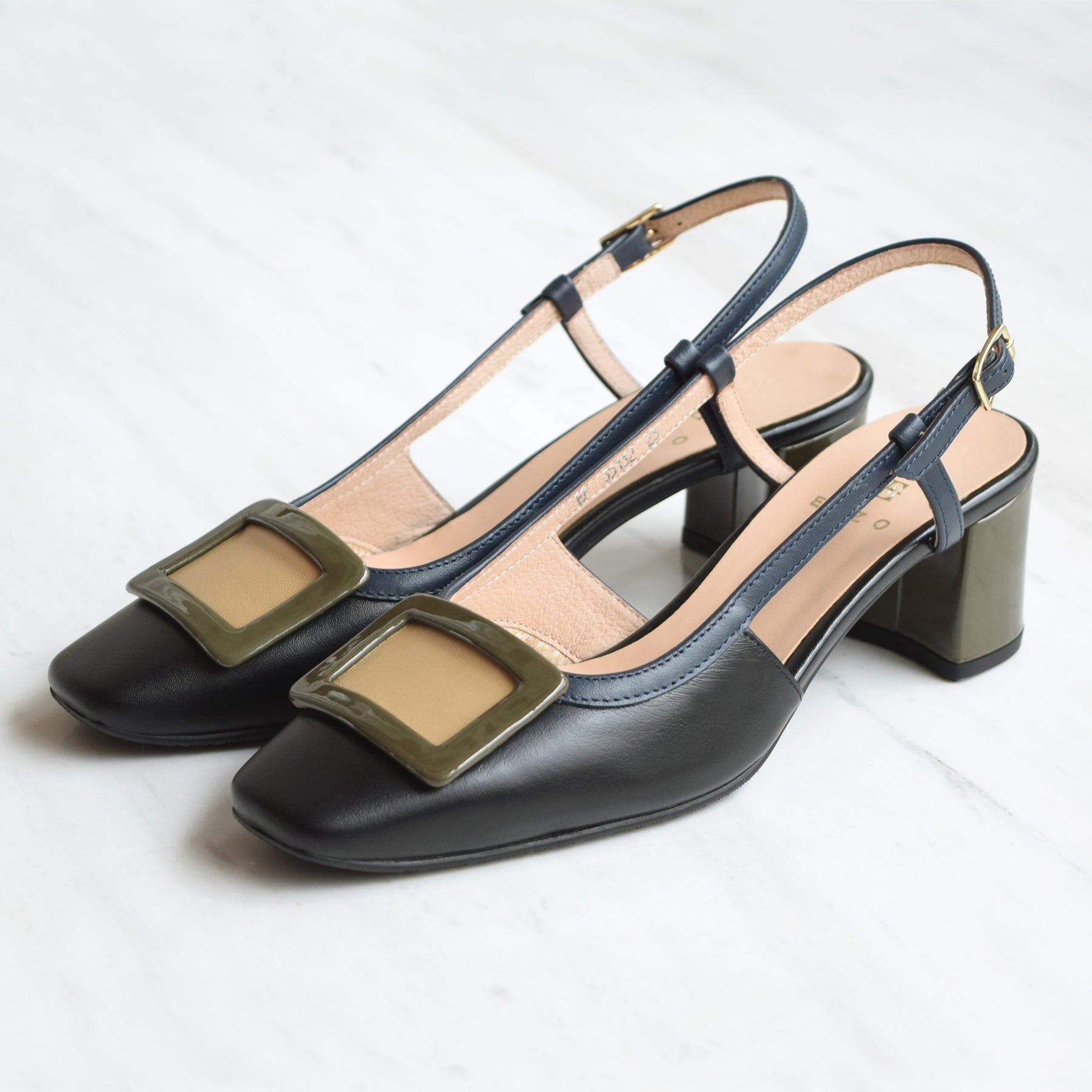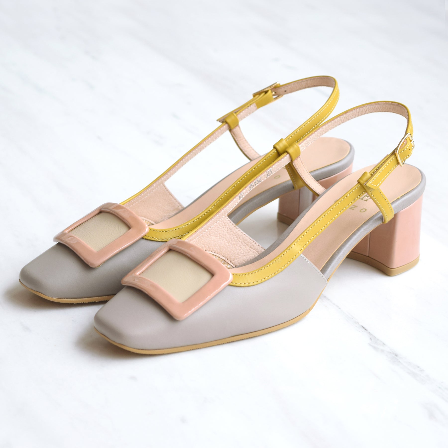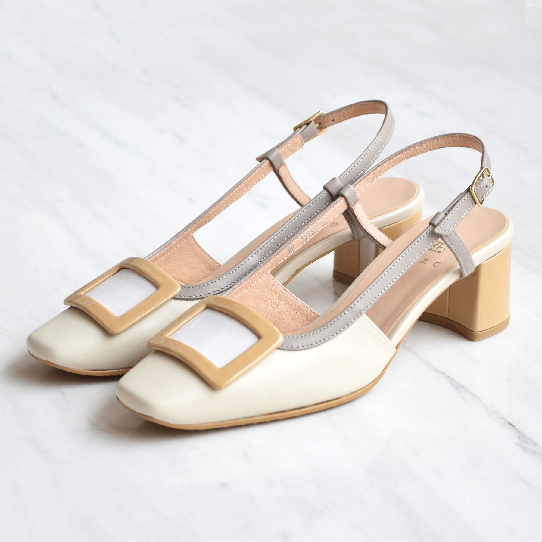 バックルモチーフと4色カラーがポイントのバックストラップパンプス。艶やかなエナメルとの素材コンビで春らしい一足です。クッション入りインソールで履き心地の良さにもこだわりました。LBG/C-ライトベージュコンビGYU/C-グレージュコンビNV/C-ネイビーコンビBL/Cーブラックコンビ素材:牛革×エナメルヒール高:5㎝