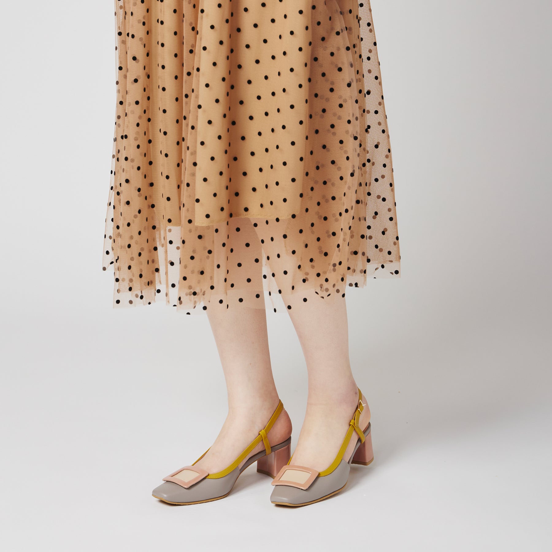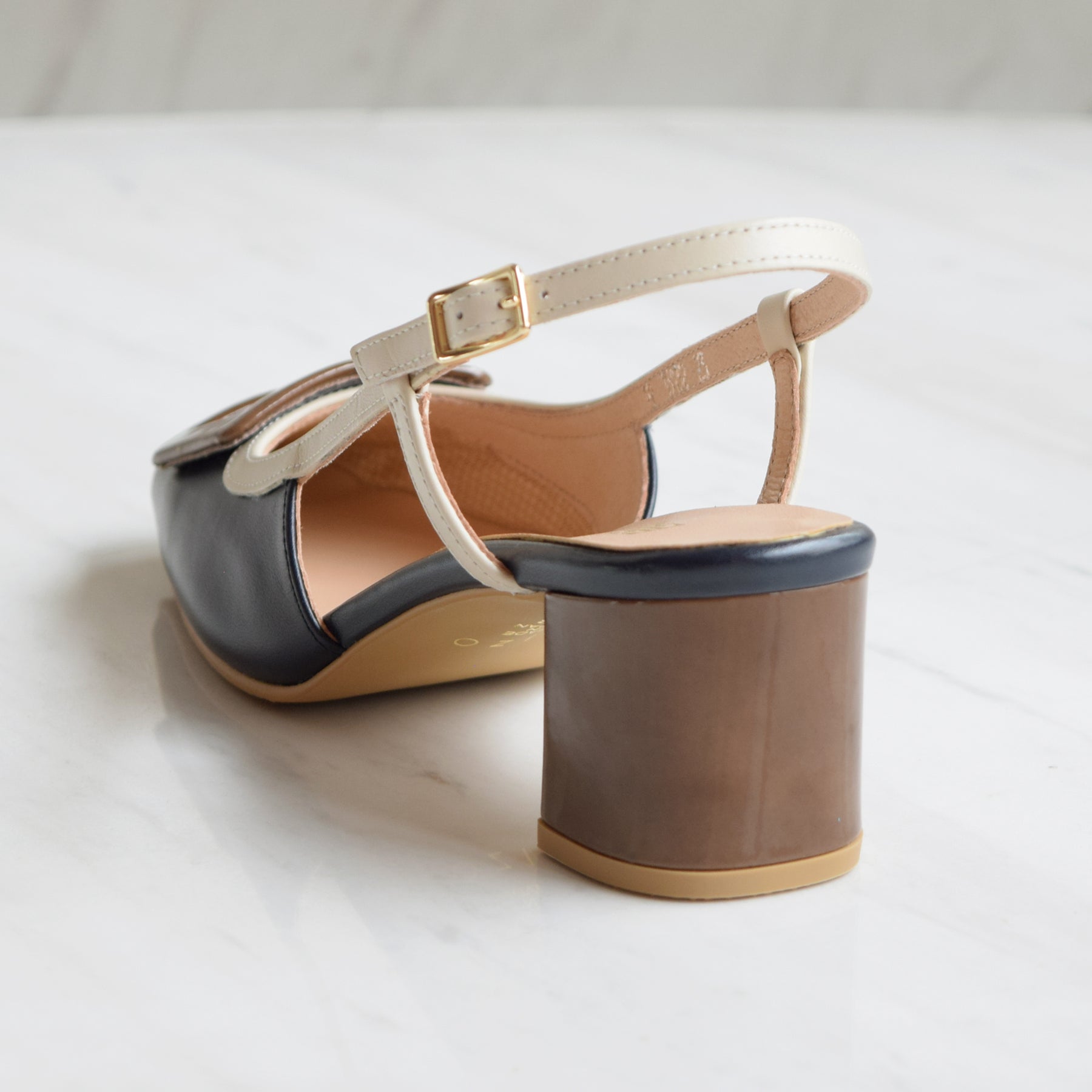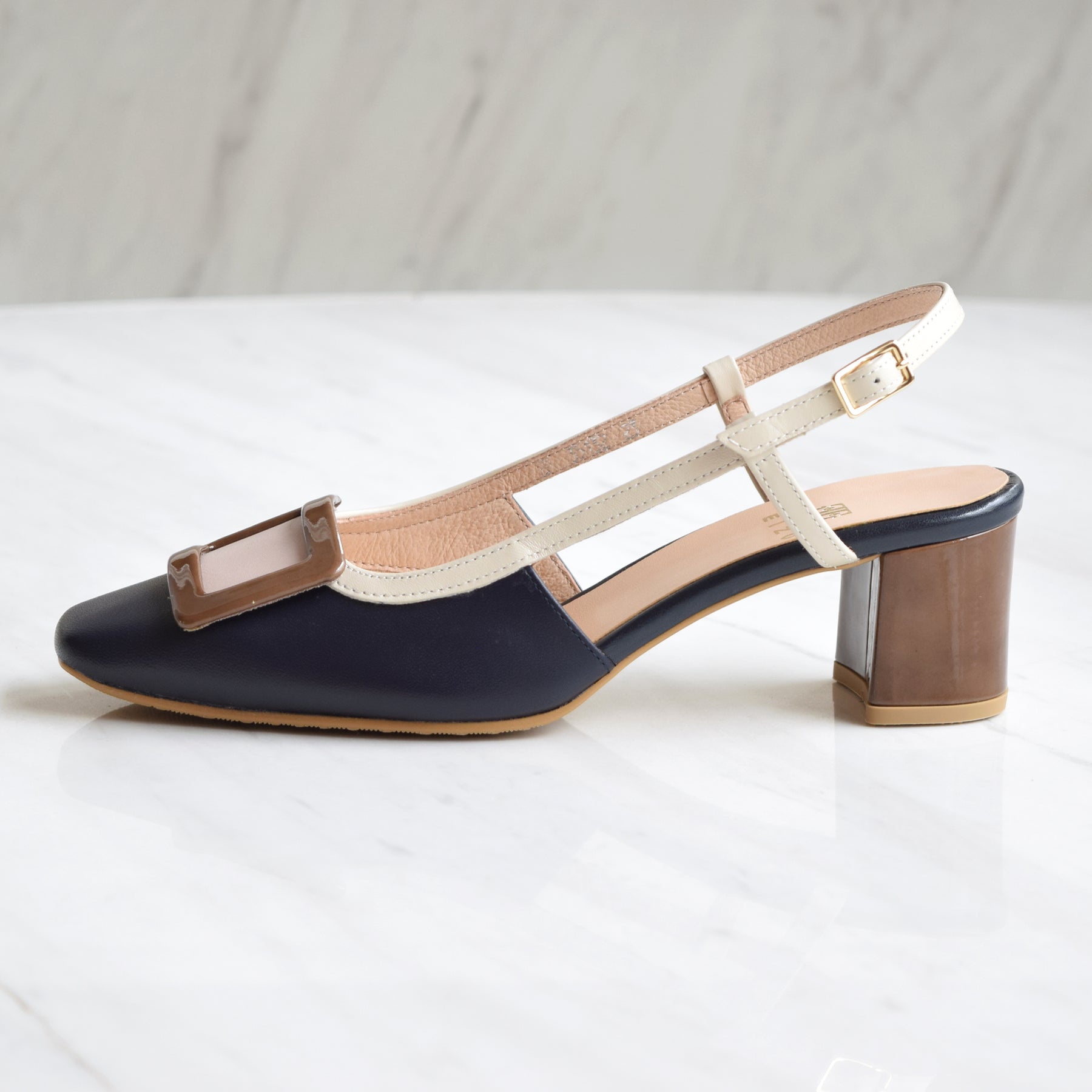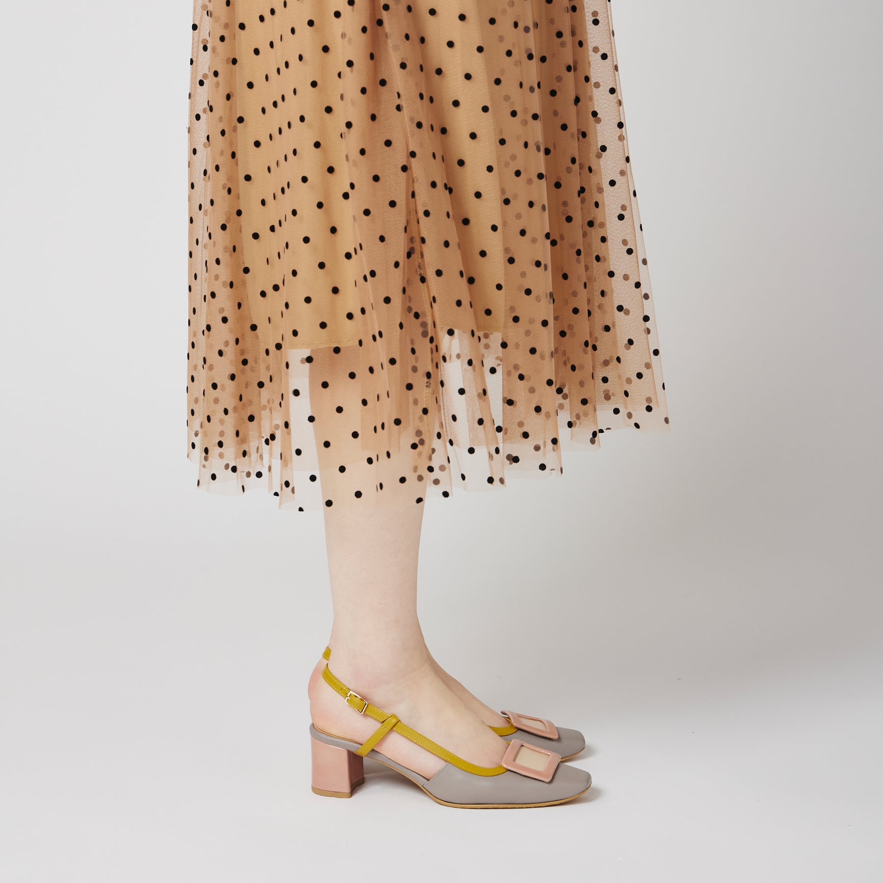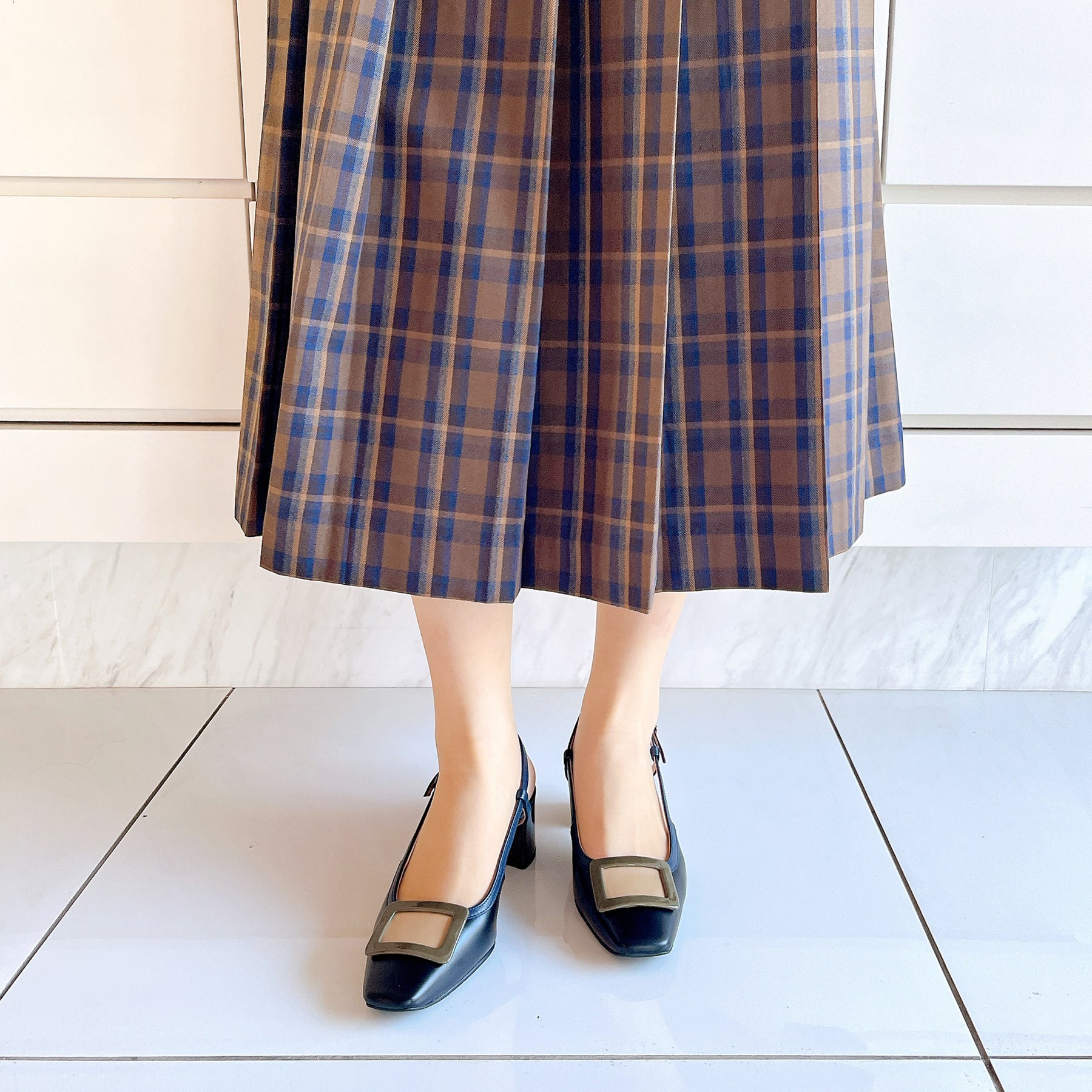 バックルモチーフと4色カラーがポイントのバックストラップパンプス。艶やかなエナメルとの素材コンビで春らしい一足です。クッション入りインソールで履き心地の良さにもこだわりました。LBG/C-ライトベージュコンビGYU/C-グレージュコンビNV/C-ネイビーコンビBL/Cーブラックコンビ素材:牛革×エナメルヒール高:5㎝