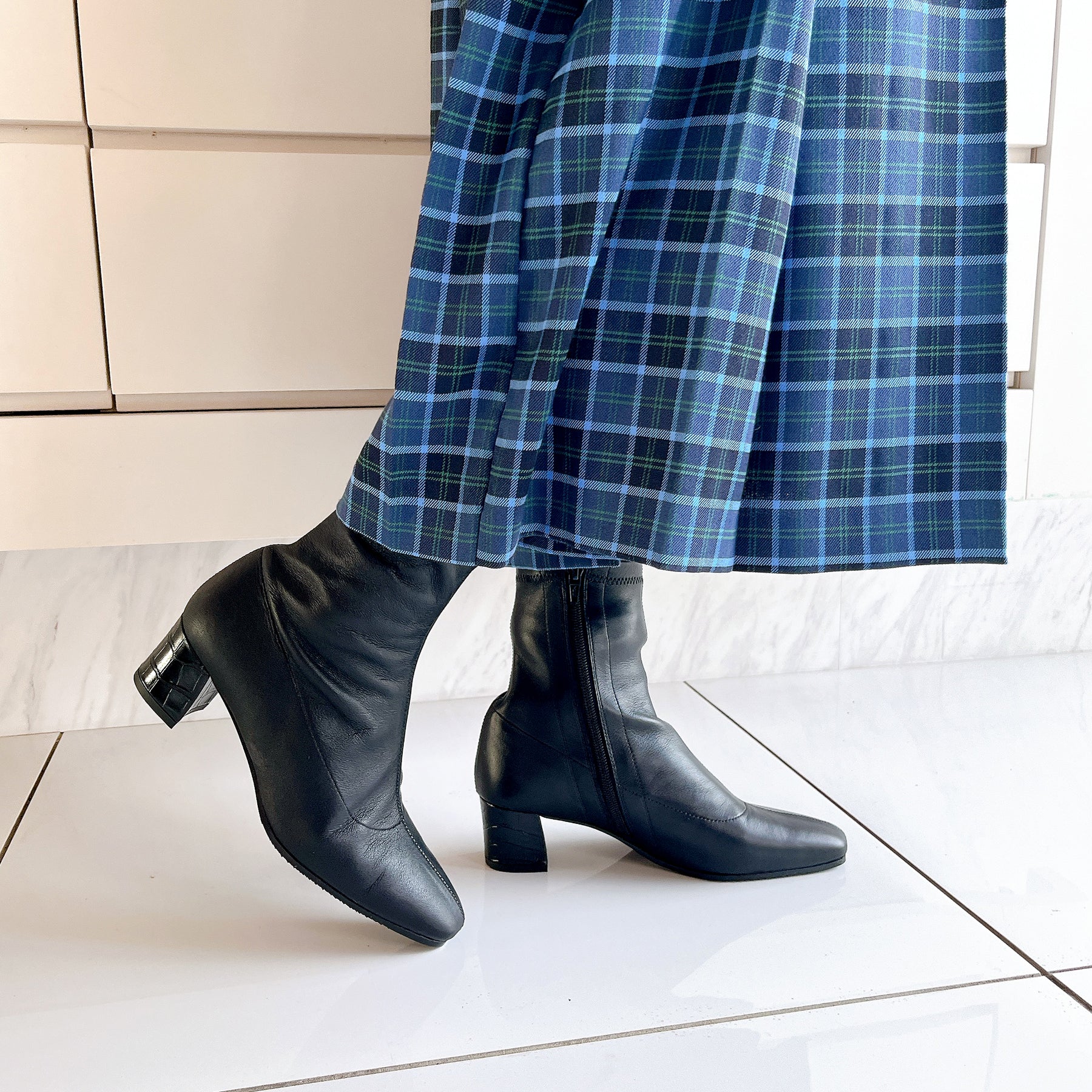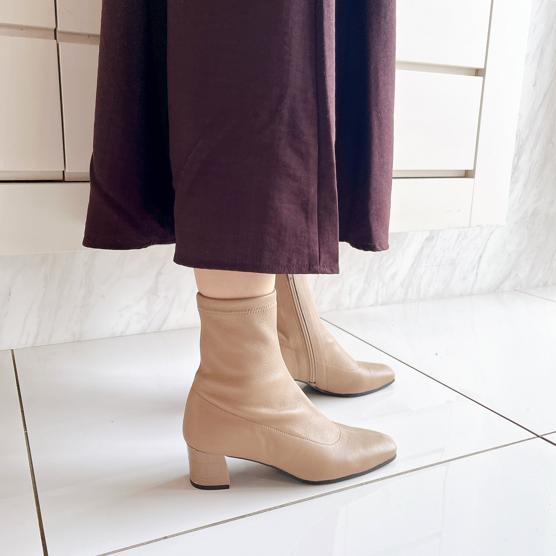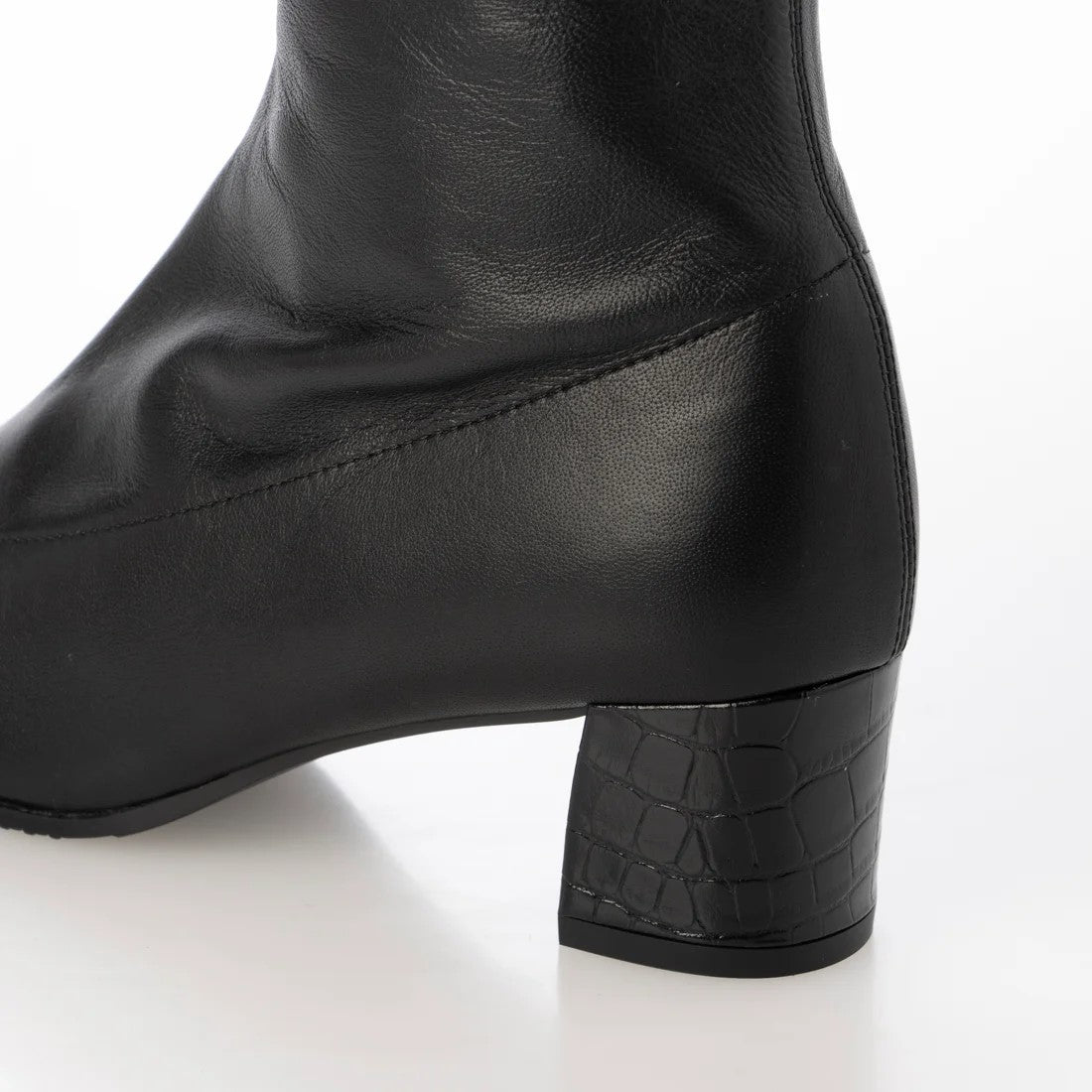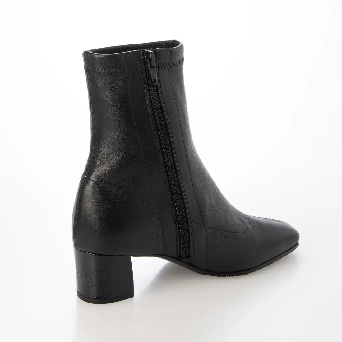 本革ストレッチレザーのショートブーツ。柔らかい羊革を使用し、甲裏にはクッションが内蔵されていてソフトな履き心地です。ヒールの型押しレザーもポイント。5cmヒールとすっきりしたシルエットでどんなボトムスにも合わせていただけます。BL-ブラックDOK-ダークオーク素材:羊革ヒール高:5㎝筒丈:16㎝ 木型:BFR45