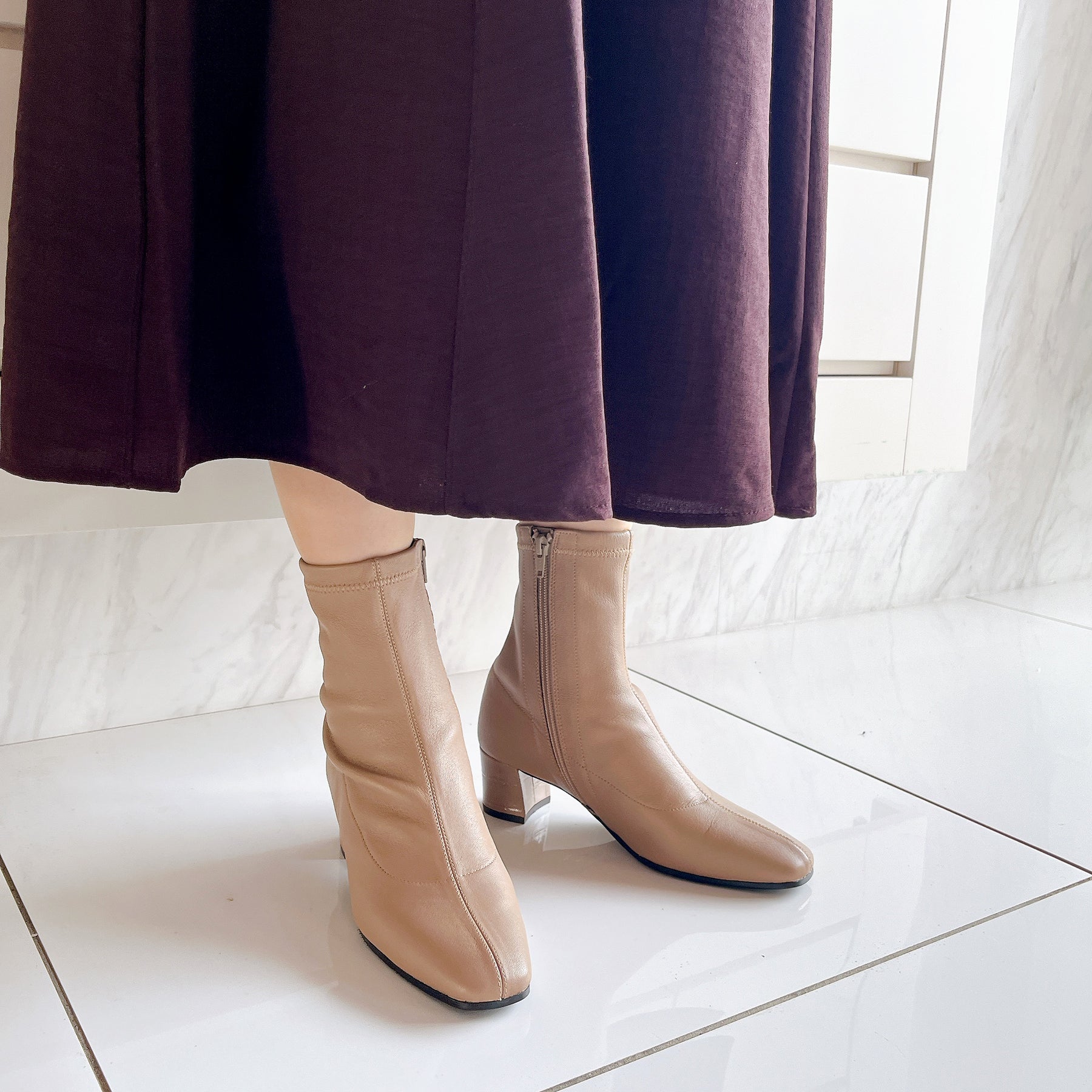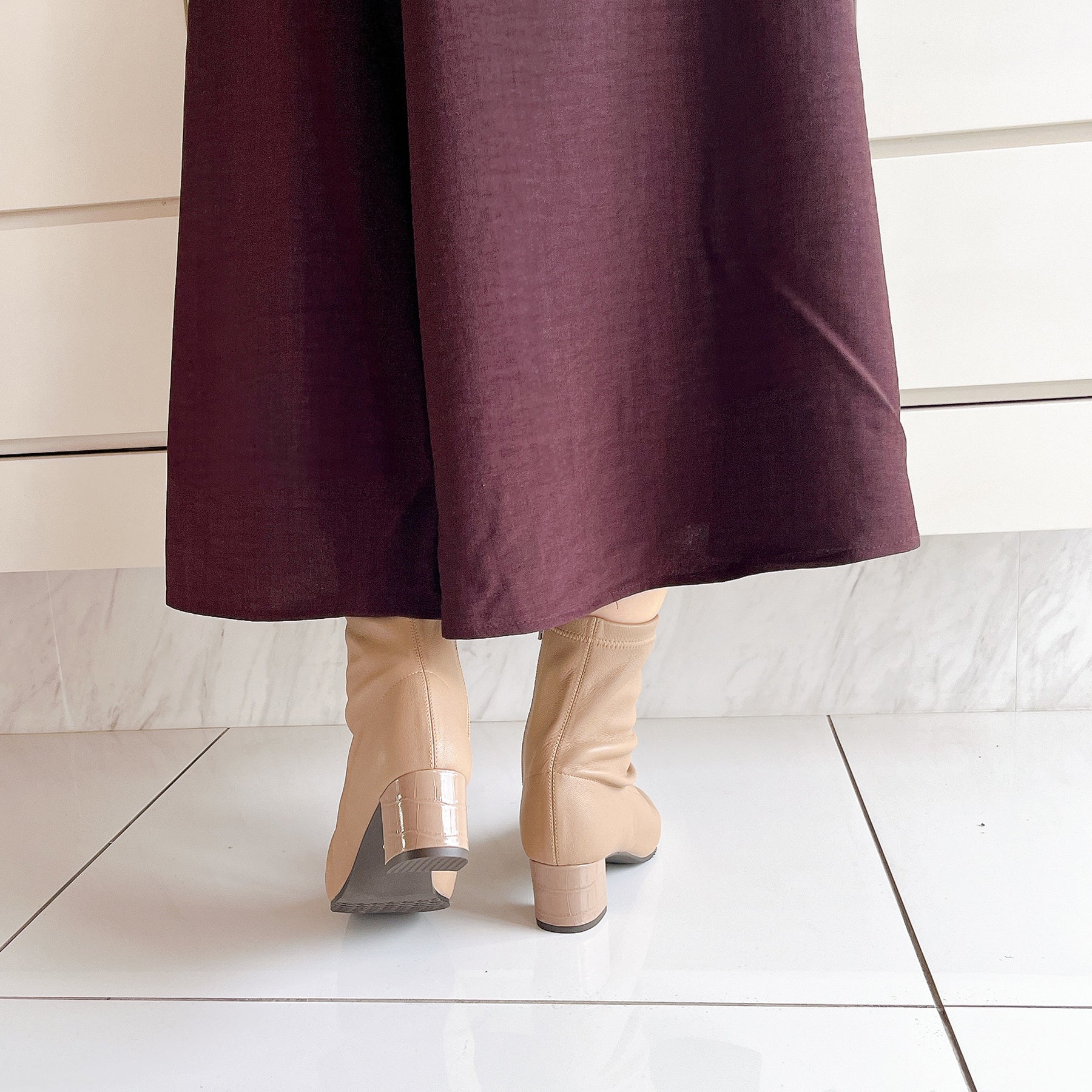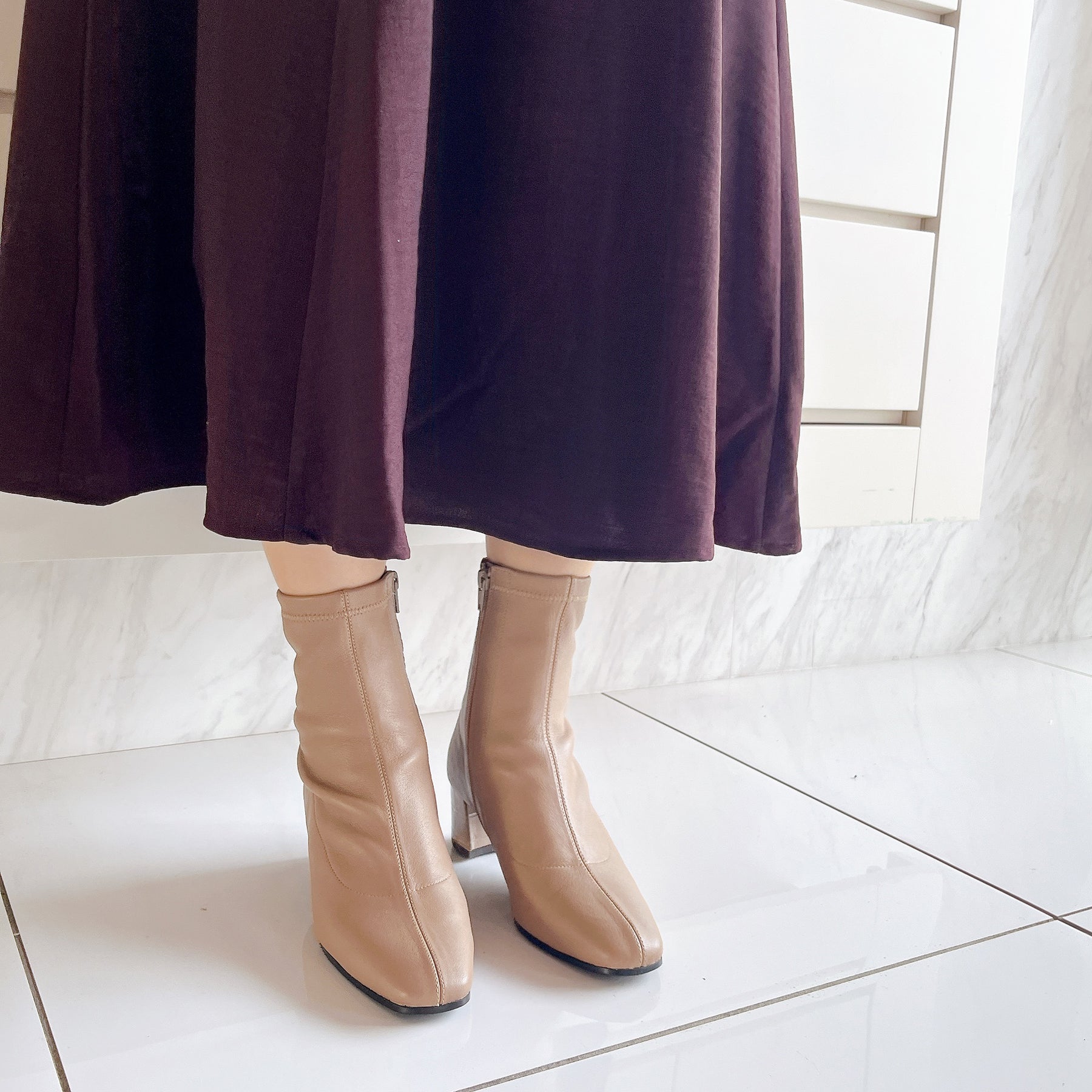 本革ストレッチレザーのショートブーツ。柔らかい羊革を使用し、甲裏にはクッションが内蔵されていてソフトな履き心地です。ヒールの型押しレザーもポイント。5cmヒールとすっきりしたシルエットでどんなボトムスにも合わせていただけます。BL-ブラックDOK-ダークオーク素材:羊革ヒール高:5㎝筒丈:16㎝ 木型:BFR45