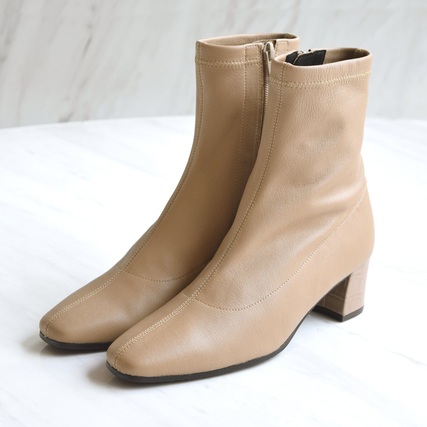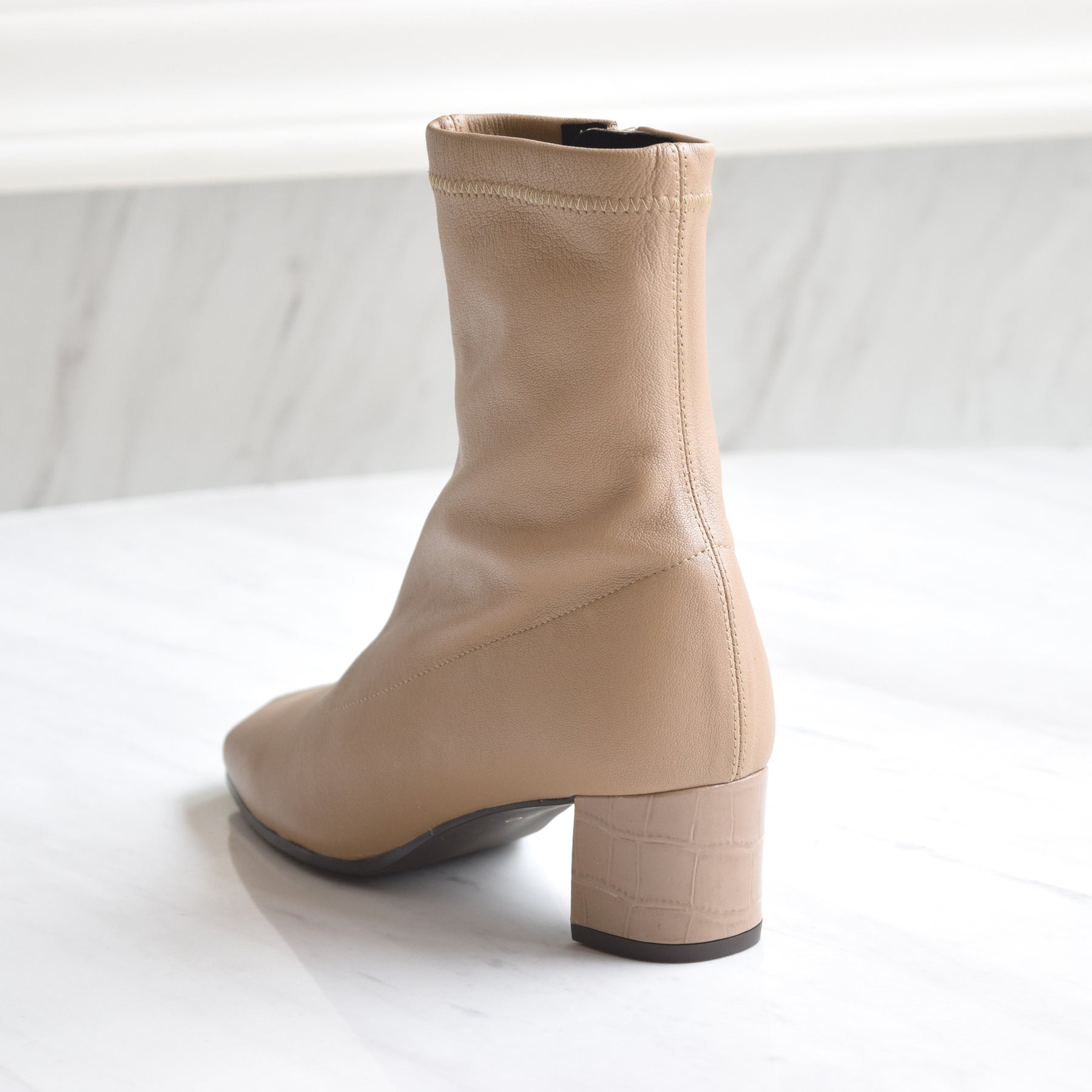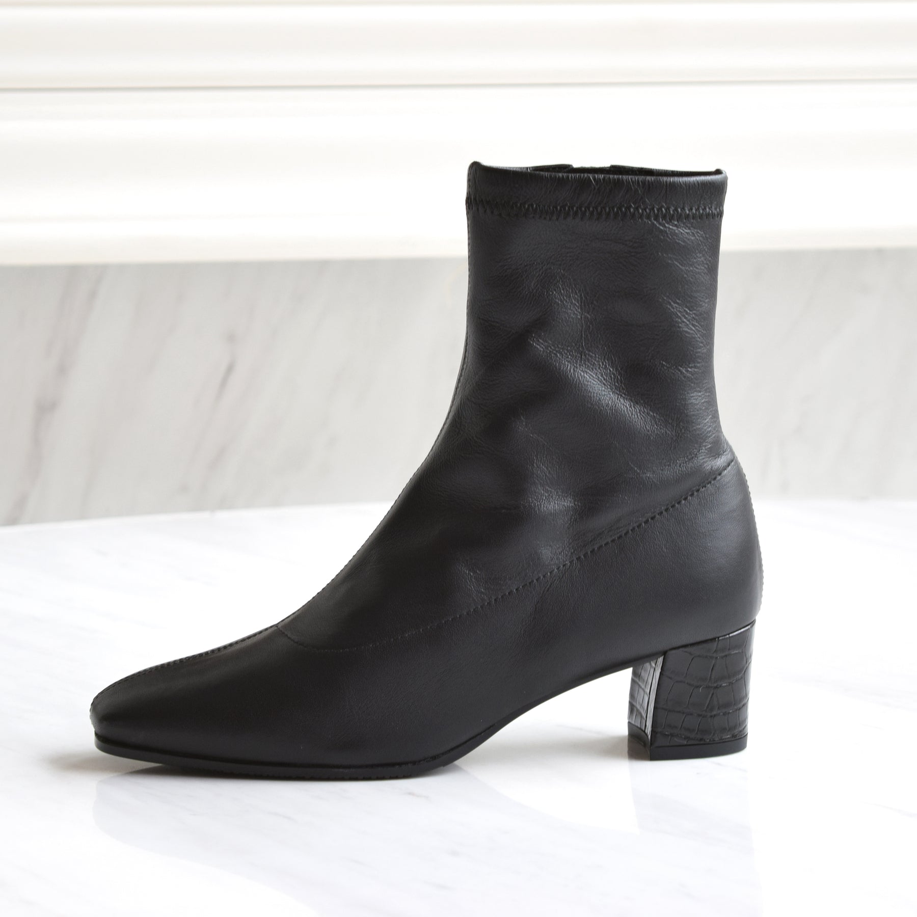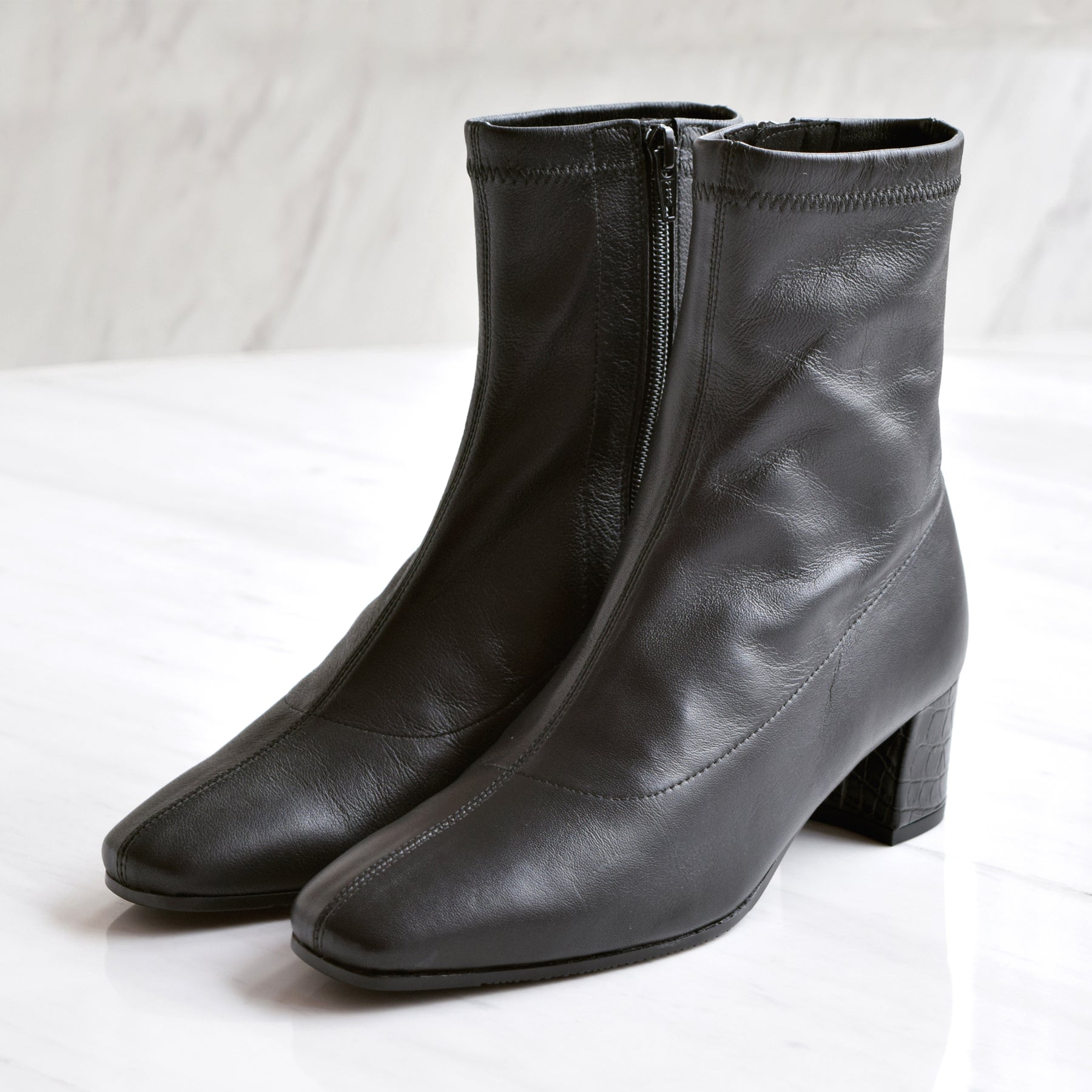 本革ストレッチレザーのショートブーツ。柔らかい羊革を使用し、甲裏にはクッションが内蔵されていてソフトな履き心地です。ヒールの型押しレザーもポイント。5cmヒールとすっきりしたシルエットでどんなボトムスにも合わせていただけます。BL-ブラックDOK-ダークオーク素材:羊革ヒール高:5㎝筒丈:16㎝ 木型:BFR45