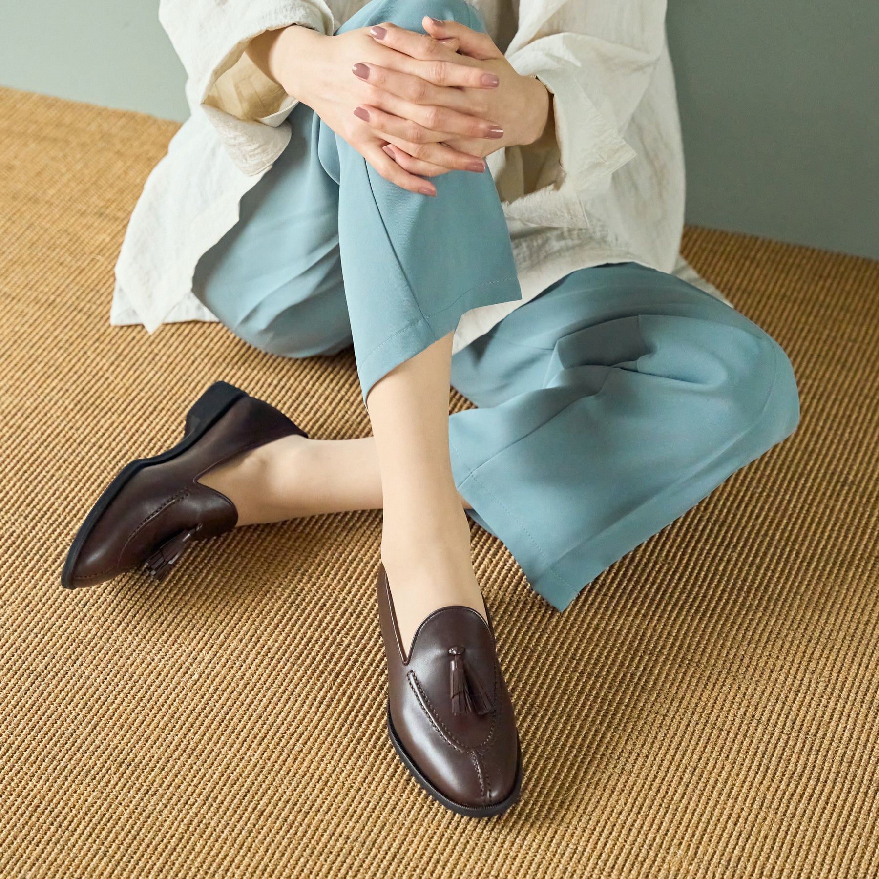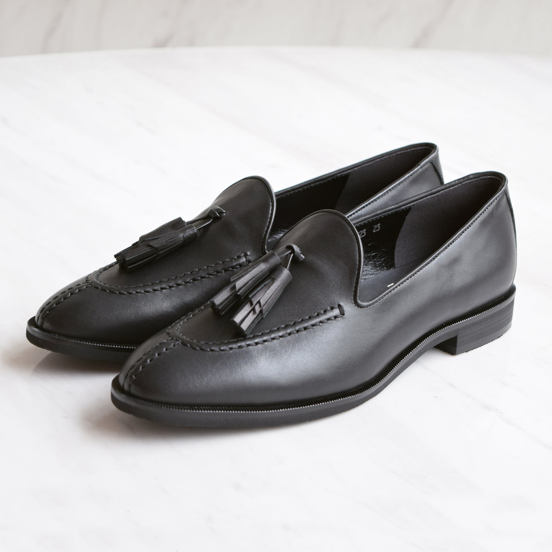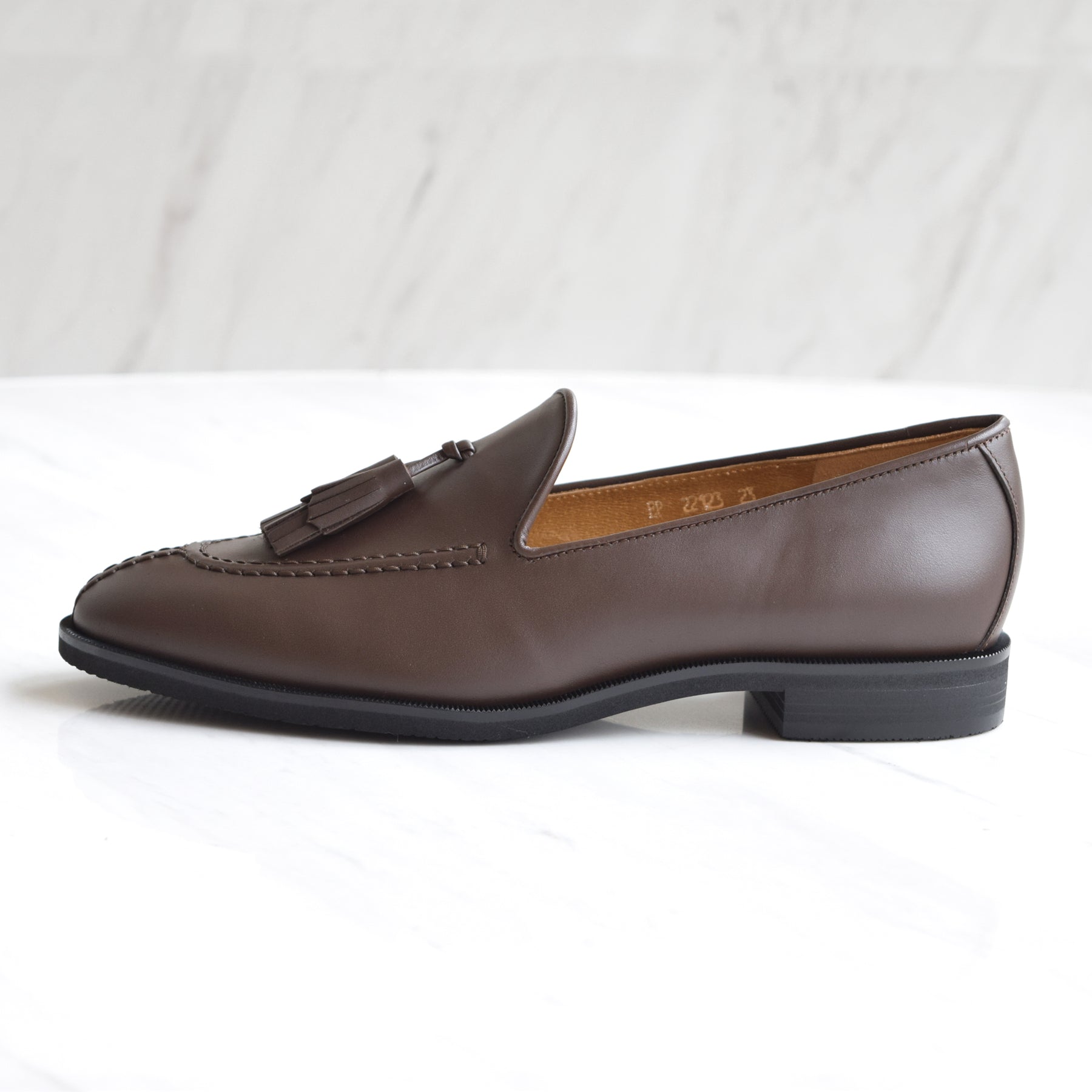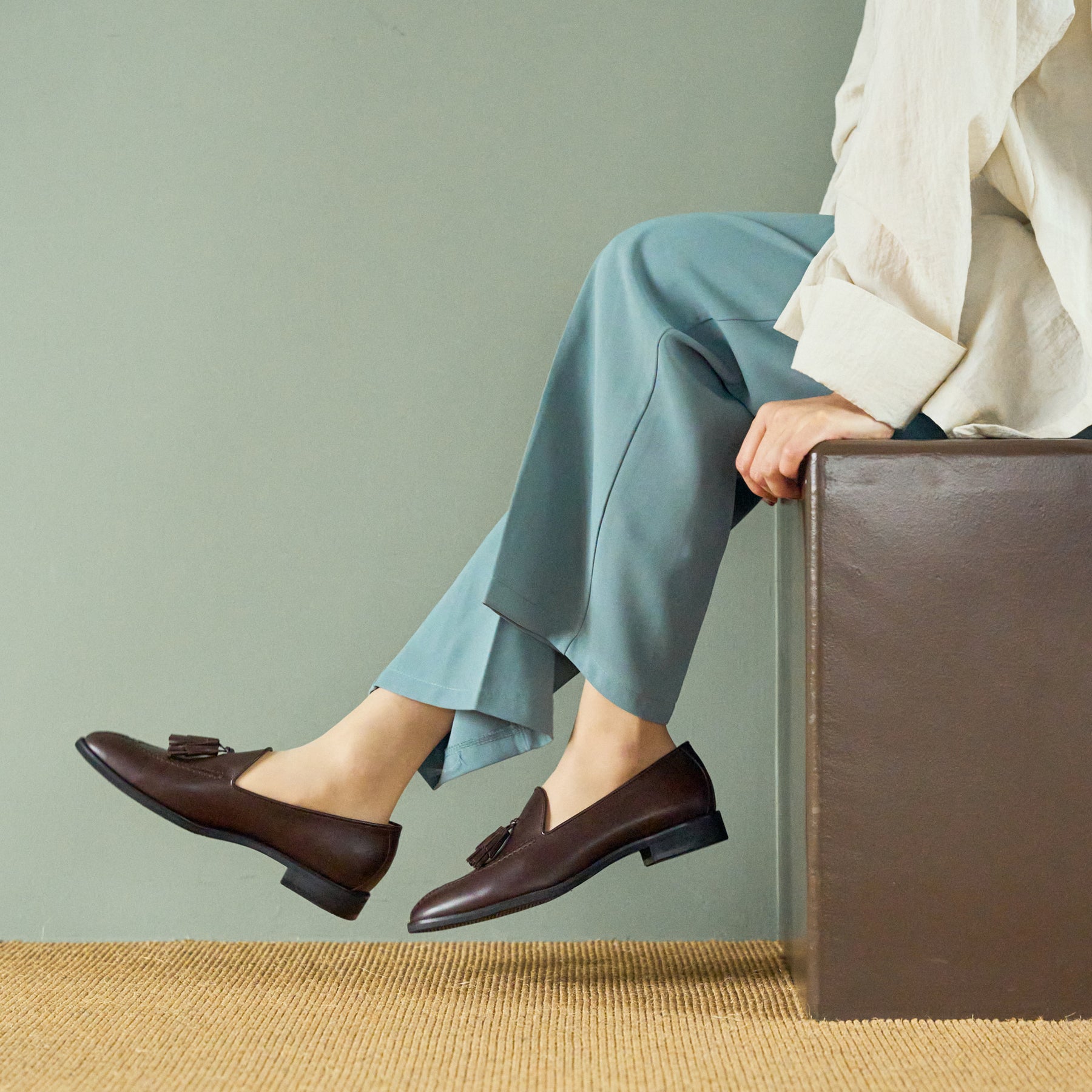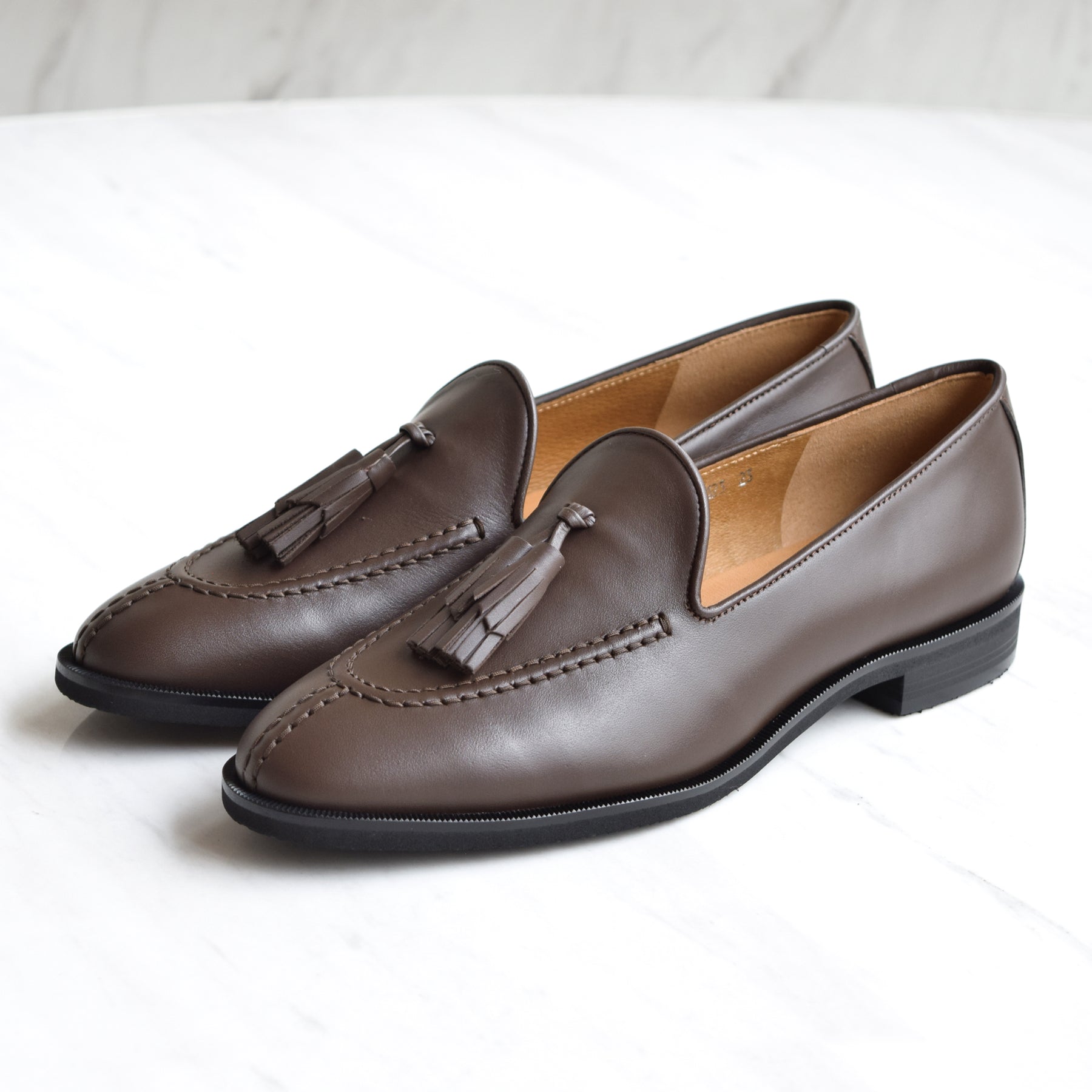 フットラップ製法を用いたタッセルローファー。革をつり込んだ後に前部の硬い中底を取り除く製法で、足を包み込むような履き心地と歩行時の返りの良さが特徴です。インソールと甲裏にもクッションを内蔵し、足あたりの快適さにもこだわりました。オンオフ兼用で使えて定番だけどアクセントになる一足です。BL-ブラックDBR-ダークブラウン素材:牛革ヒール高:2㎝