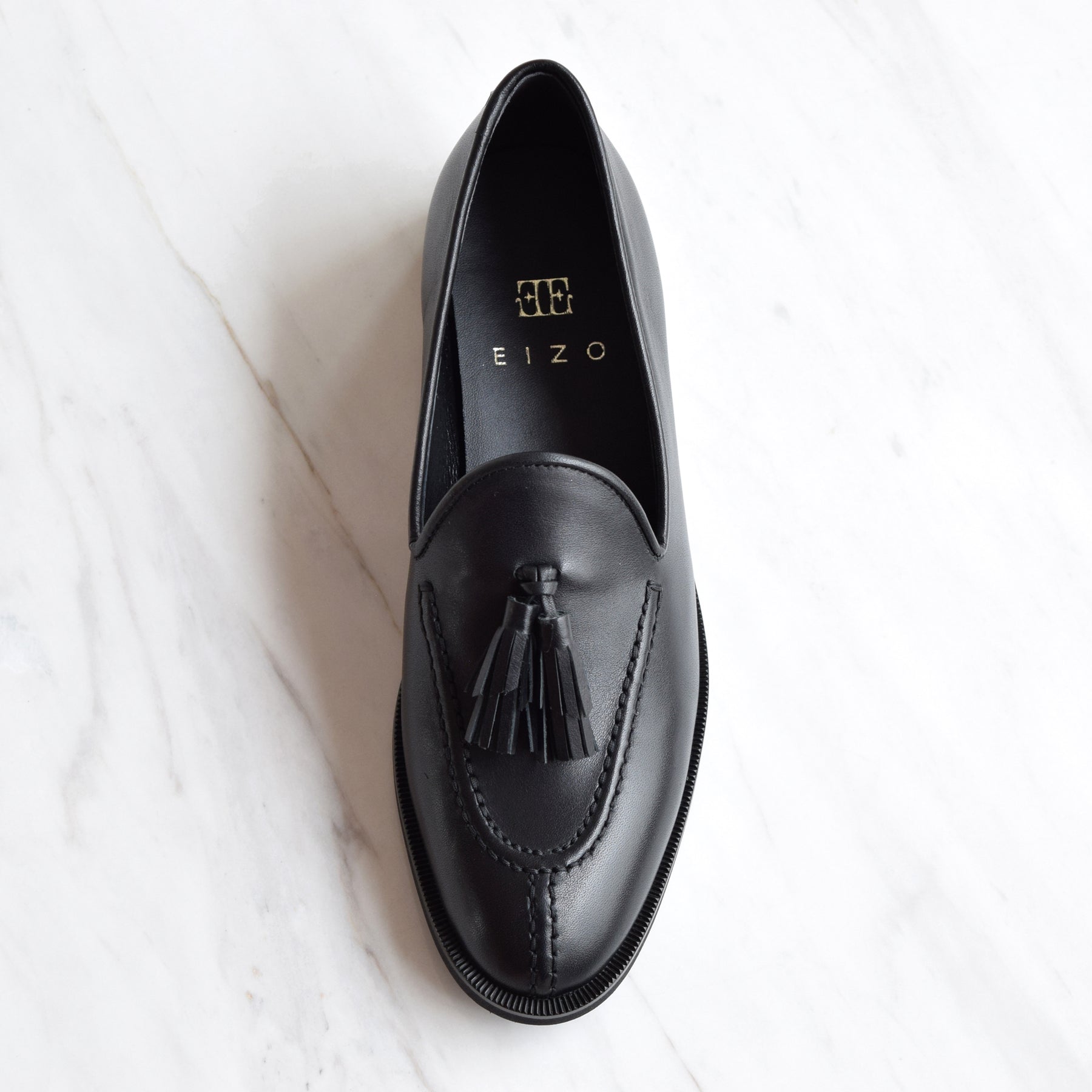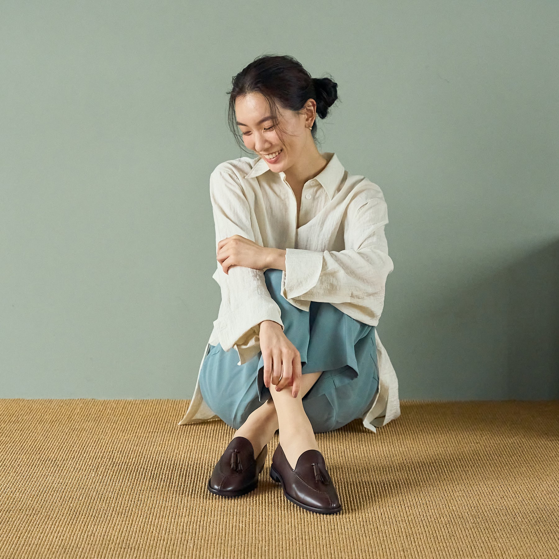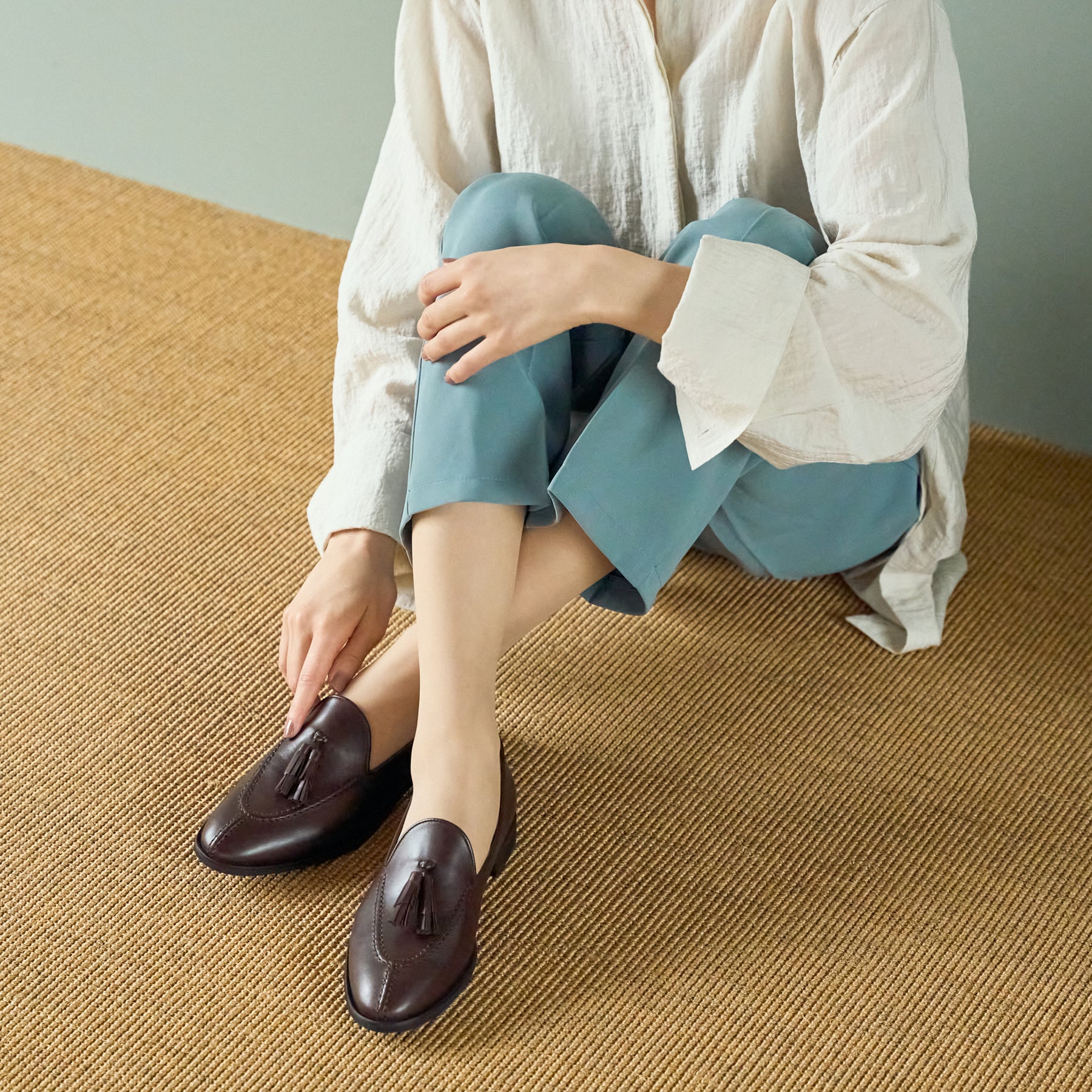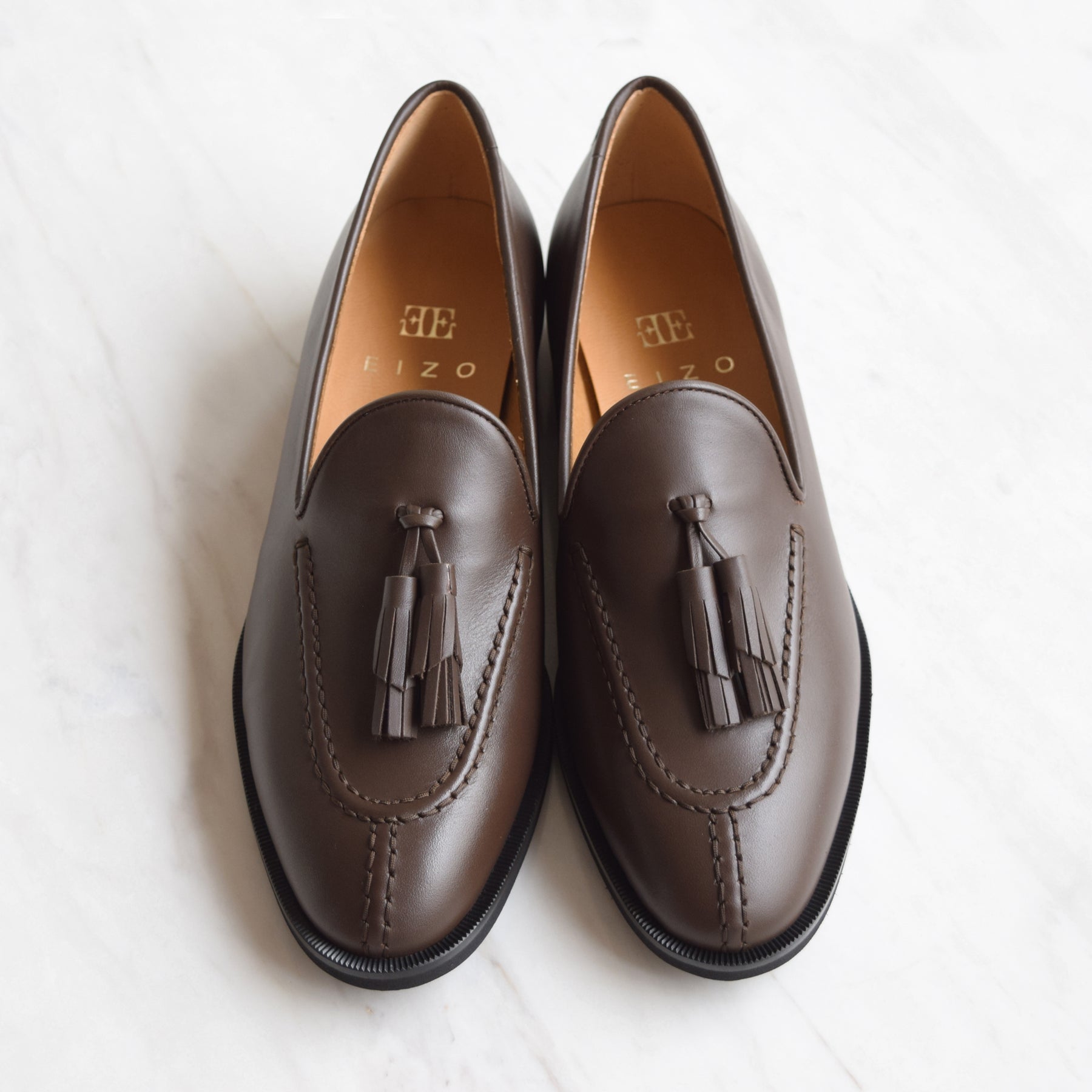 フットラップ製法を用いたタッセルローファー。革をつり込んだ後に前部の硬い中底を取り除く製法で、足を包み込むような履き心地と歩行時の返りの良さが特徴です。インソールと甲裏にもクッションを内蔵し、足あたりの快適さにもこだわりました。オンオフ兼用で使えて定番だけどアクセントになる一足です。BL-ブラックDBR-ダークブラウン素材:牛革ヒール高:2㎝