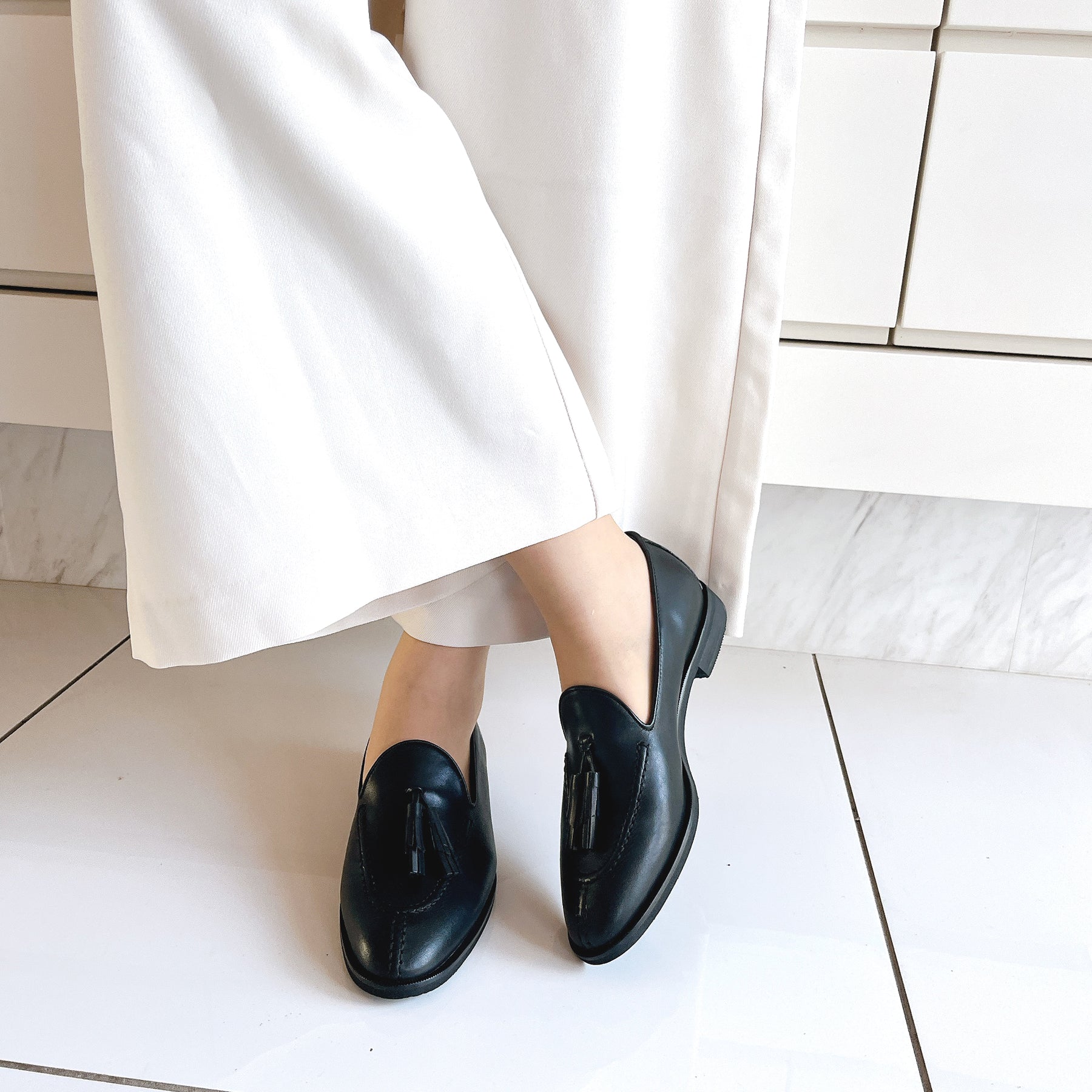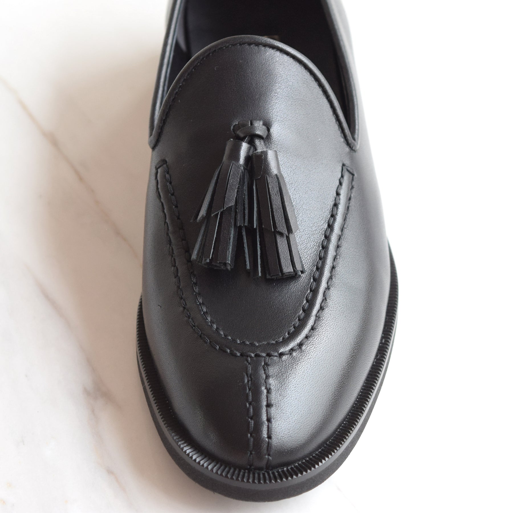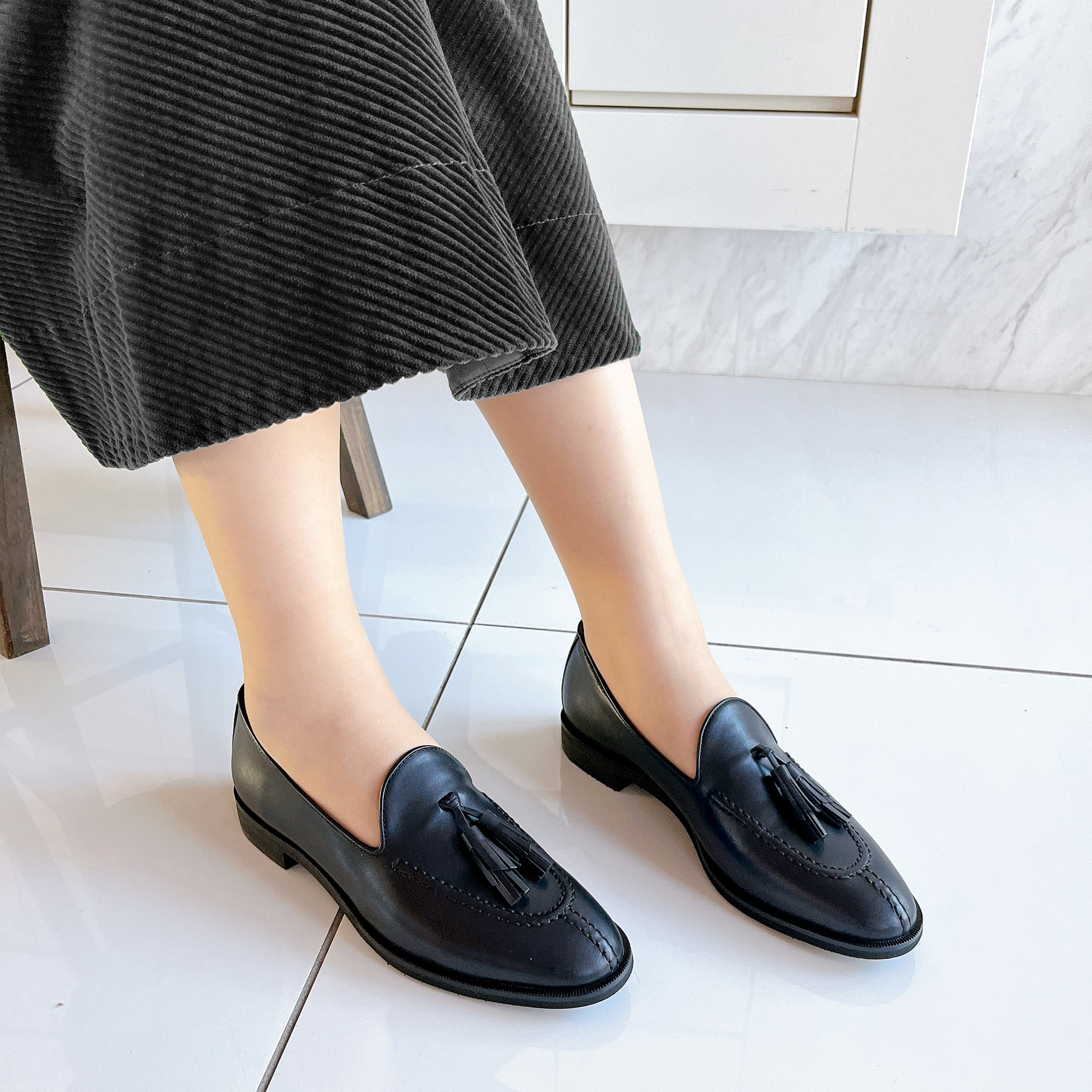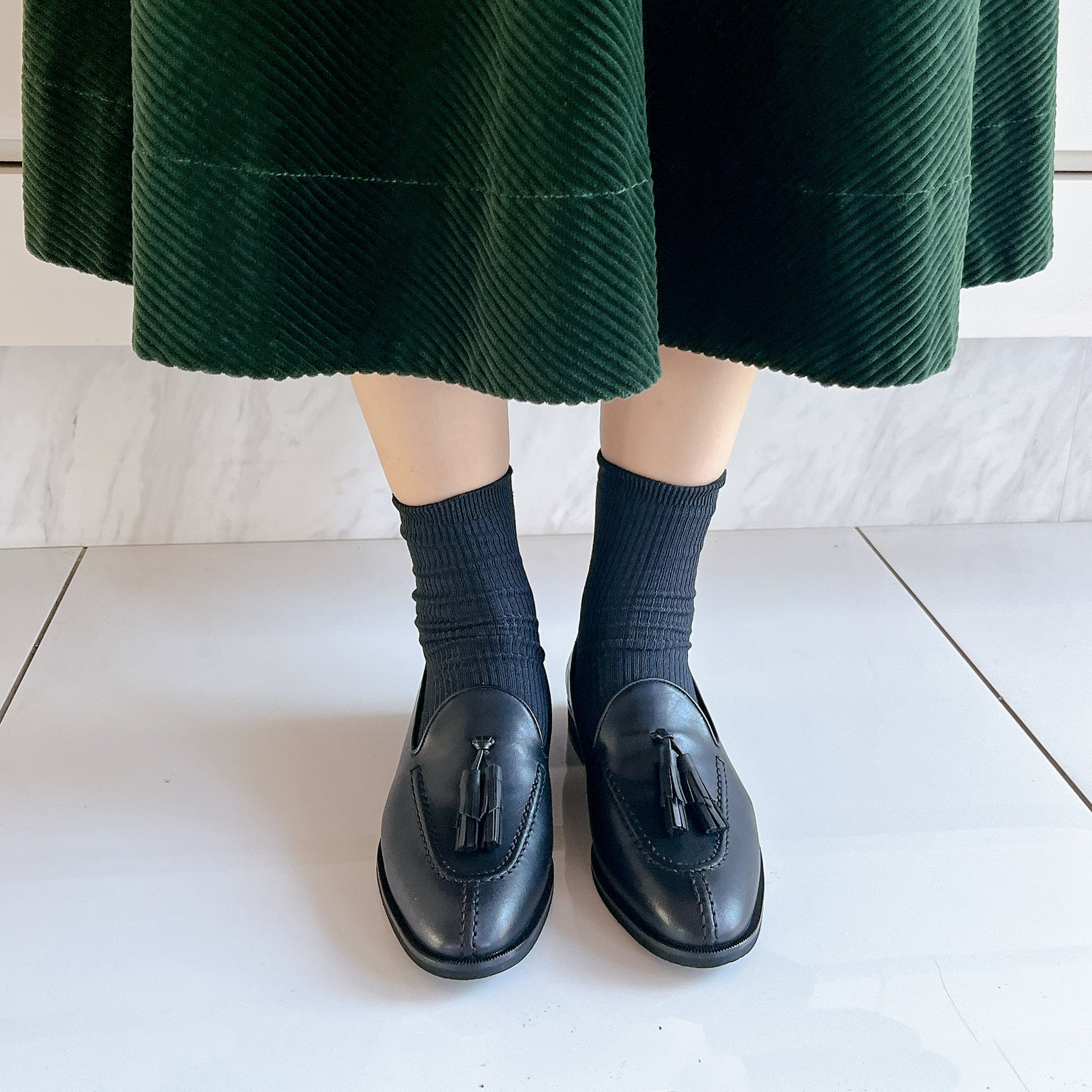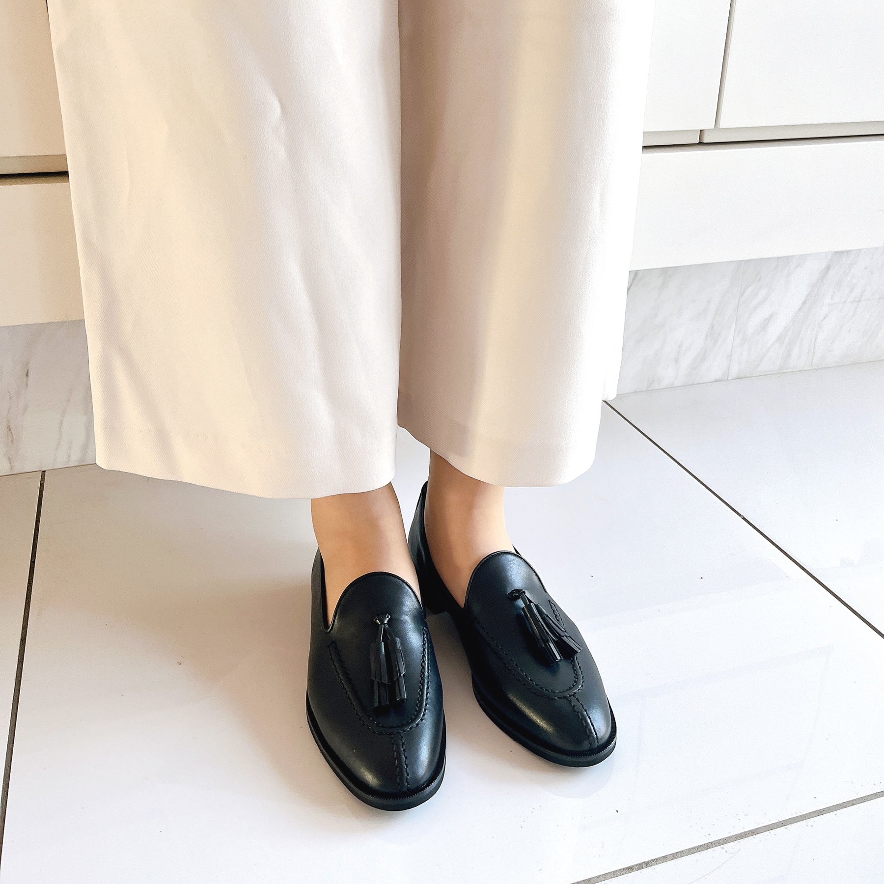 フットラップ製法を用いたタッセルローファー。革をつり込んだ後に前部の硬い中底を取り除く製法で、足を包み込むような履き心地と歩行時の返りの良さが特徴です。インソールと甲裏にもクッションを内蔵し、足あたりの快適さにもこだわりました。オンオフ兼用で使えて定番だけどアクセントになる一足です。BL-ブラックDBR-ダークブラウン素材:牛革ヒール高:2㎝