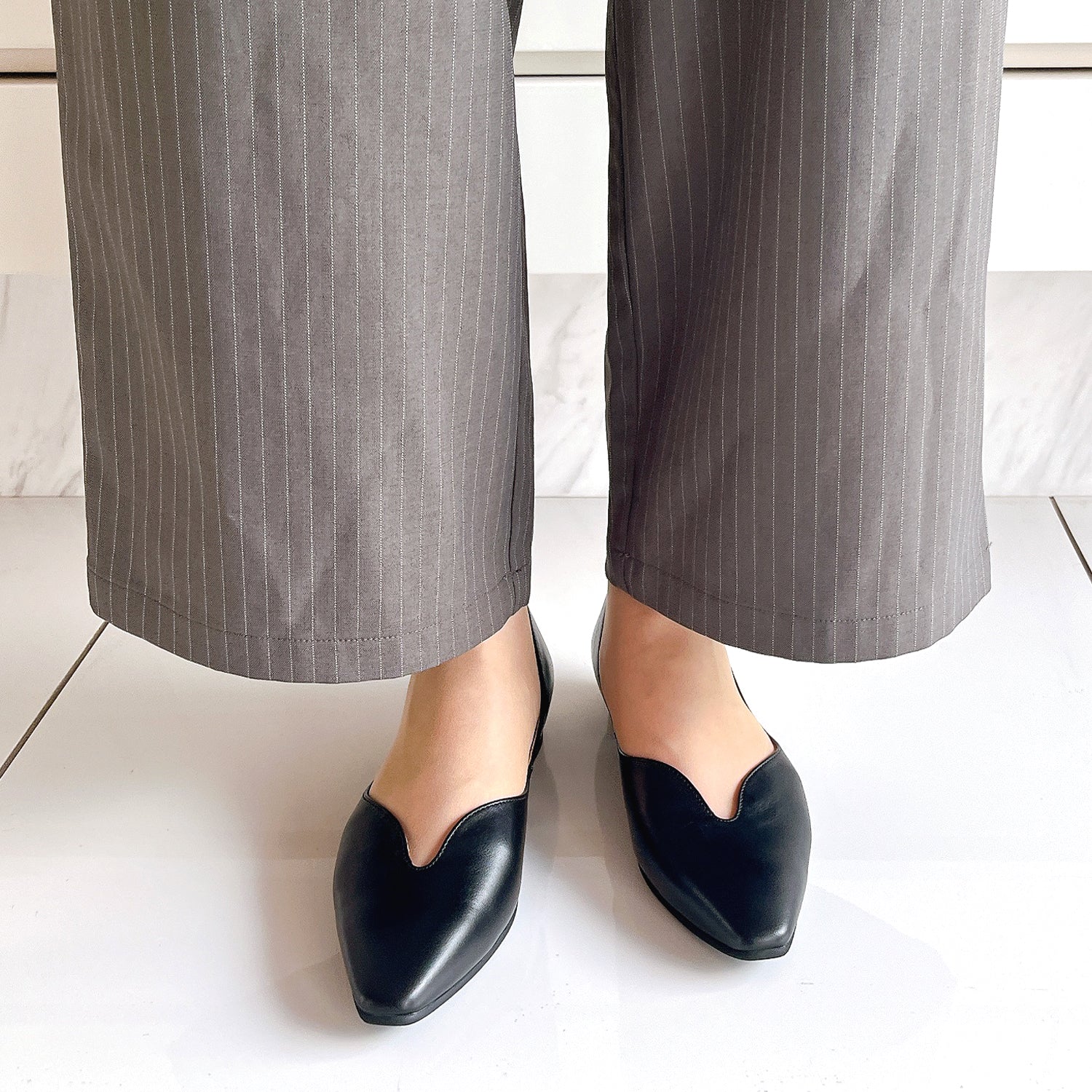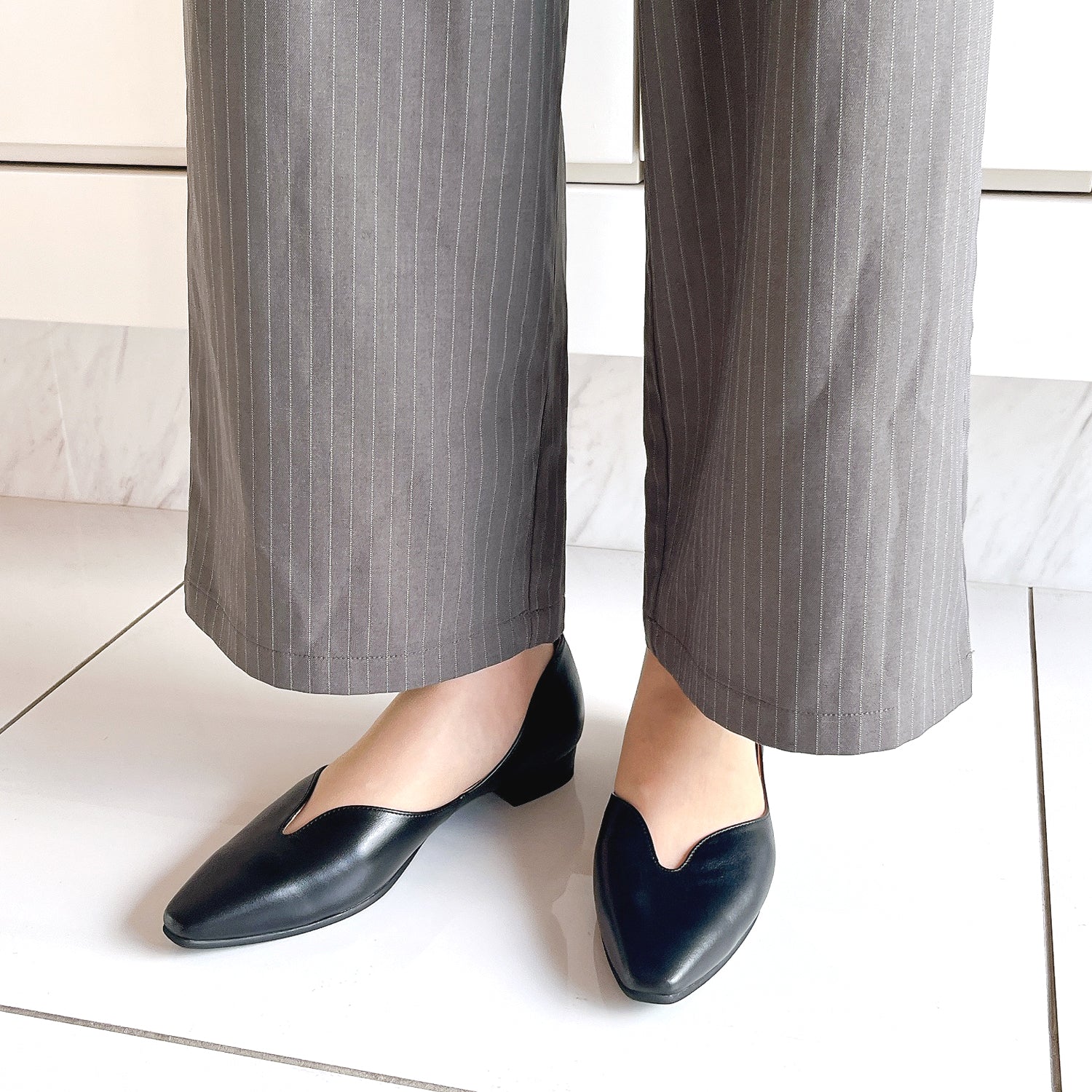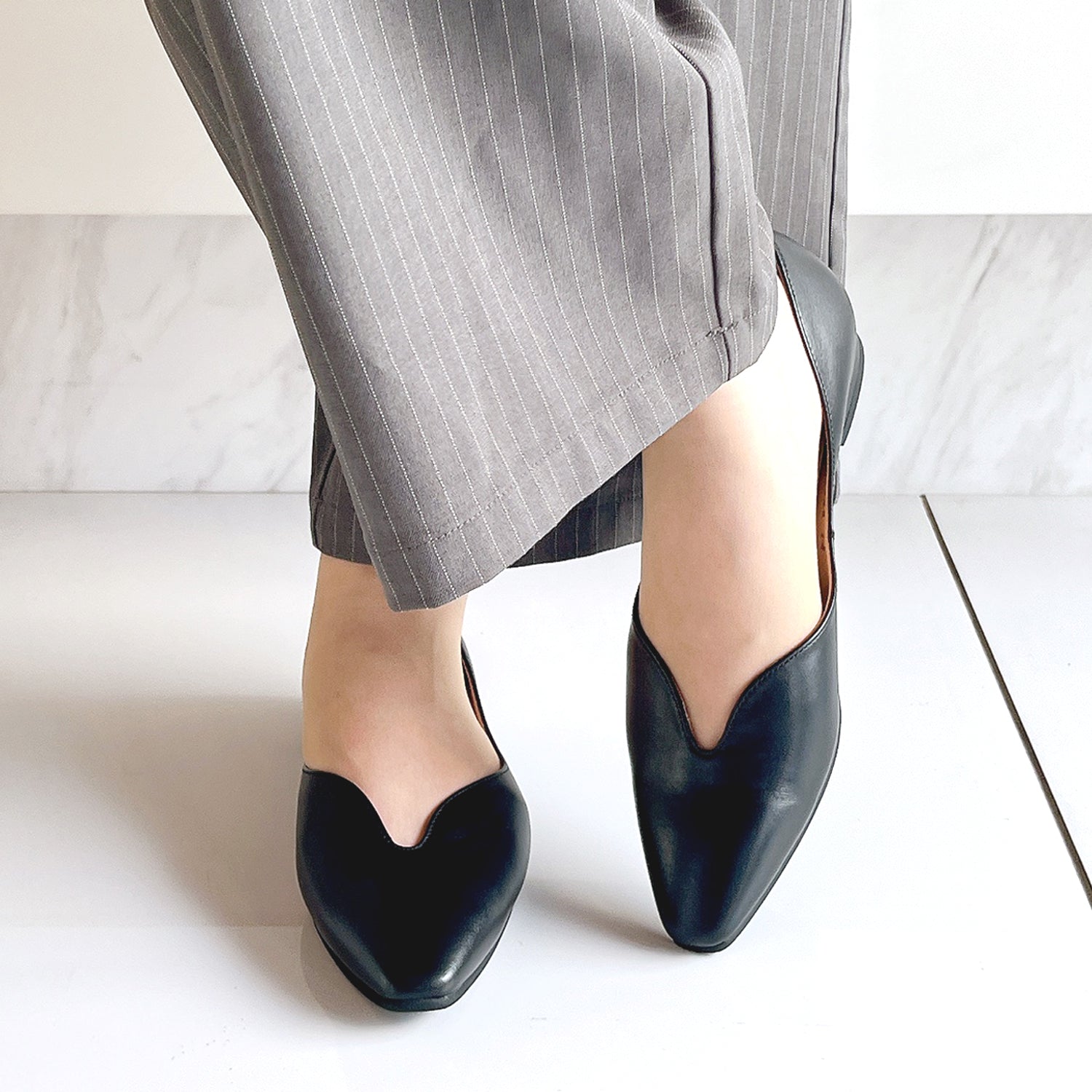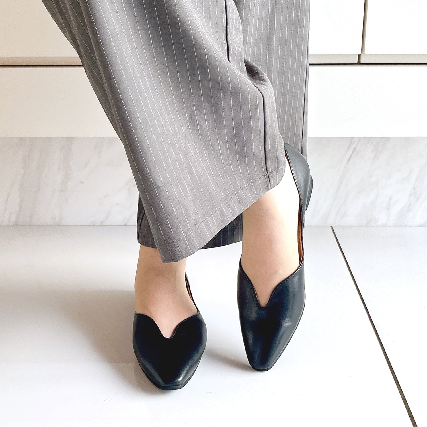 甲のUカットがポイントのスクエアパンプス。シンプルなデザインはどんなボトムにも合わせていただけます。