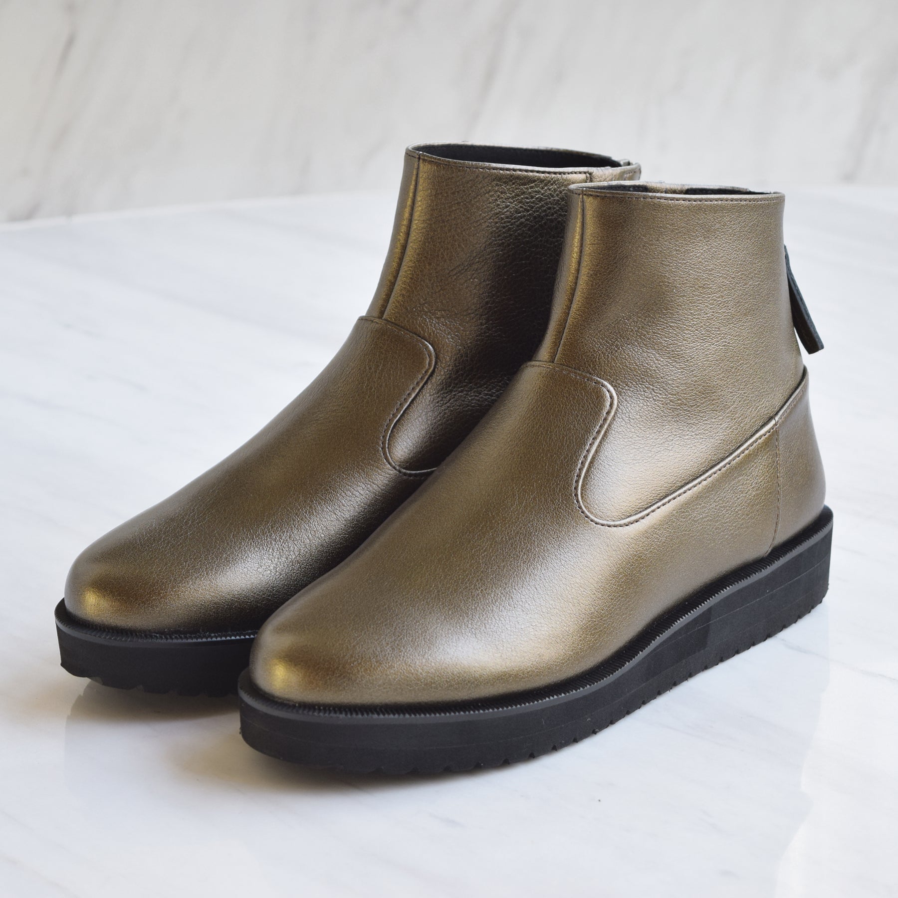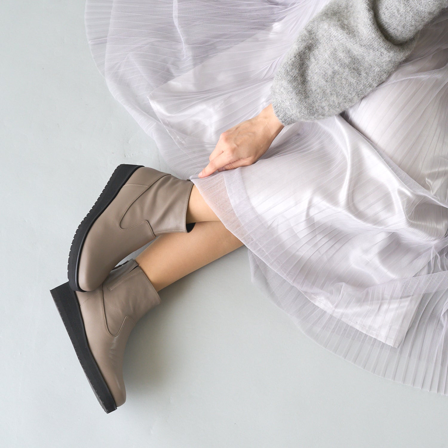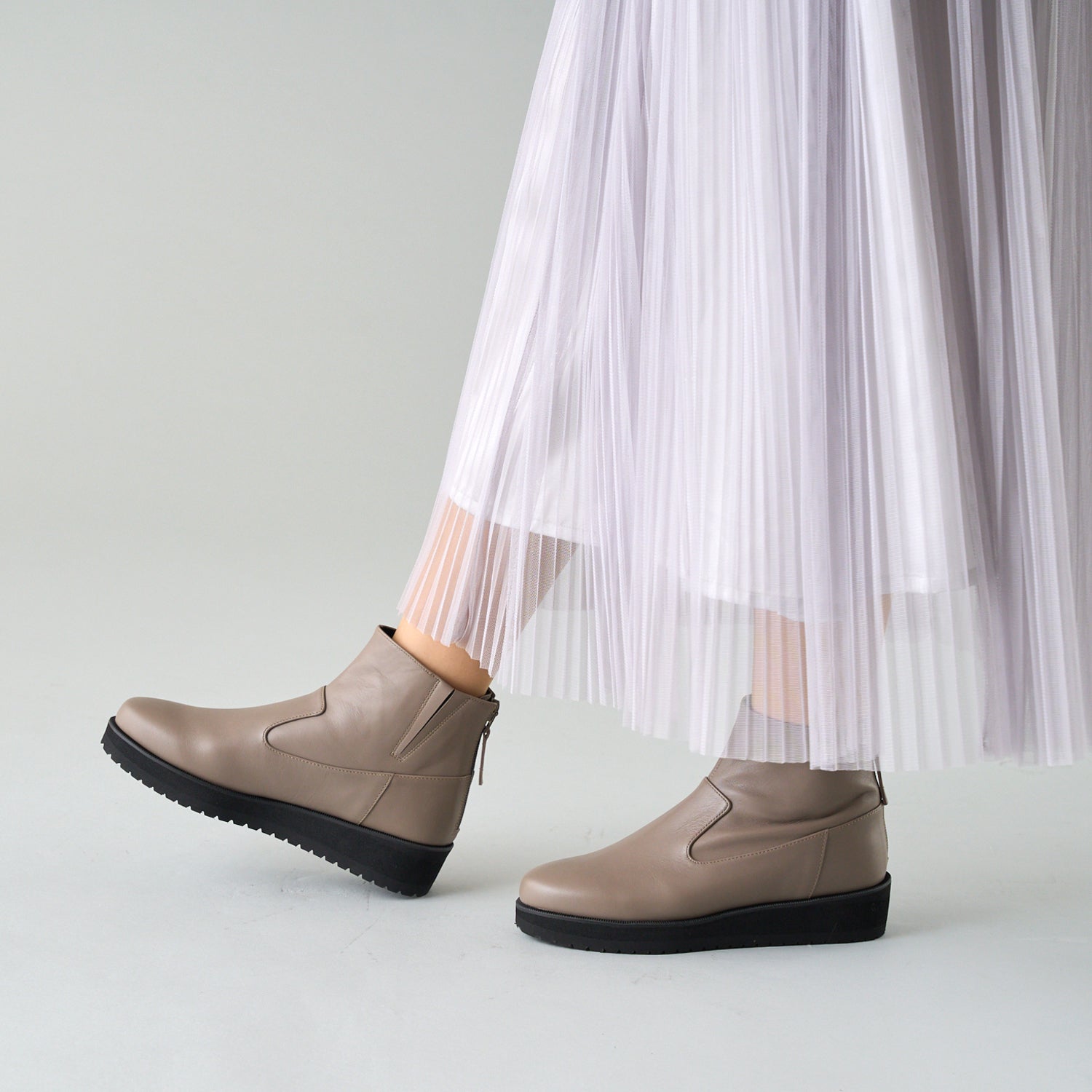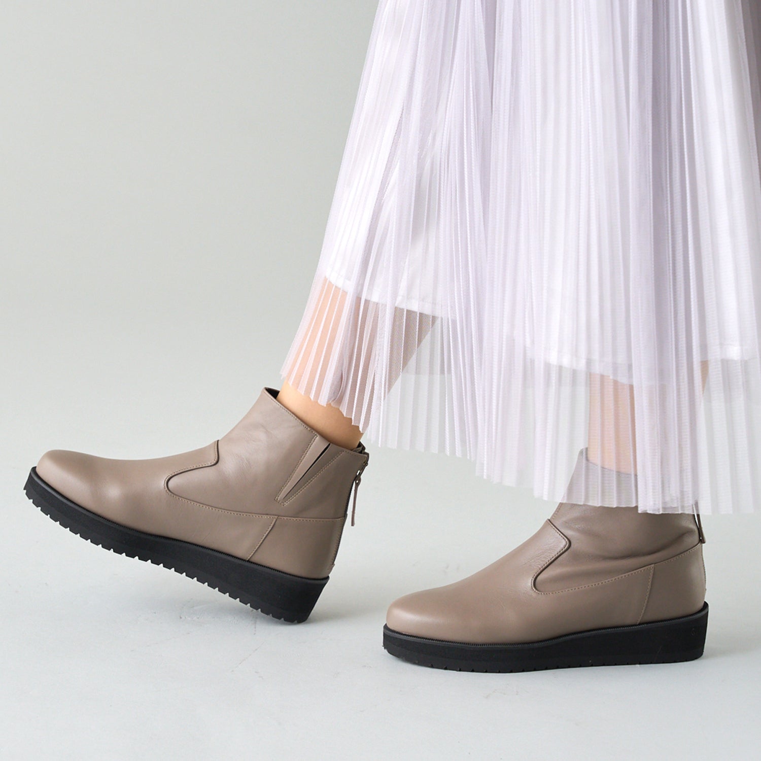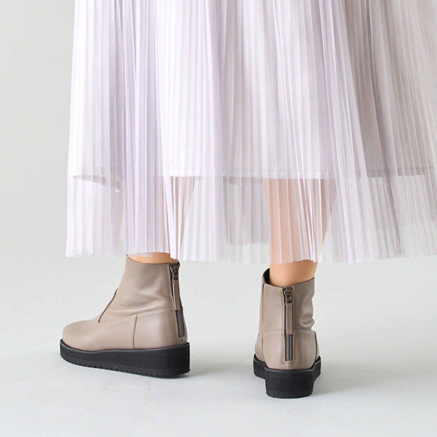 バックジップがポイントのスニーカー底ショートブーツ。内側にはスリットゴムが入っており履き心地も抜群です。アウトソールは軽量でクッション性も高い素材を使用。歩きやすさとスタイルアップを両立させました。GYU-グレージュBL-ブラックBZ-ブロンズ素材:GYU・BL-羊革 BZ-メタリック牛革ヒール高:3㎝(傾斜1cm)筒丈:11㎝