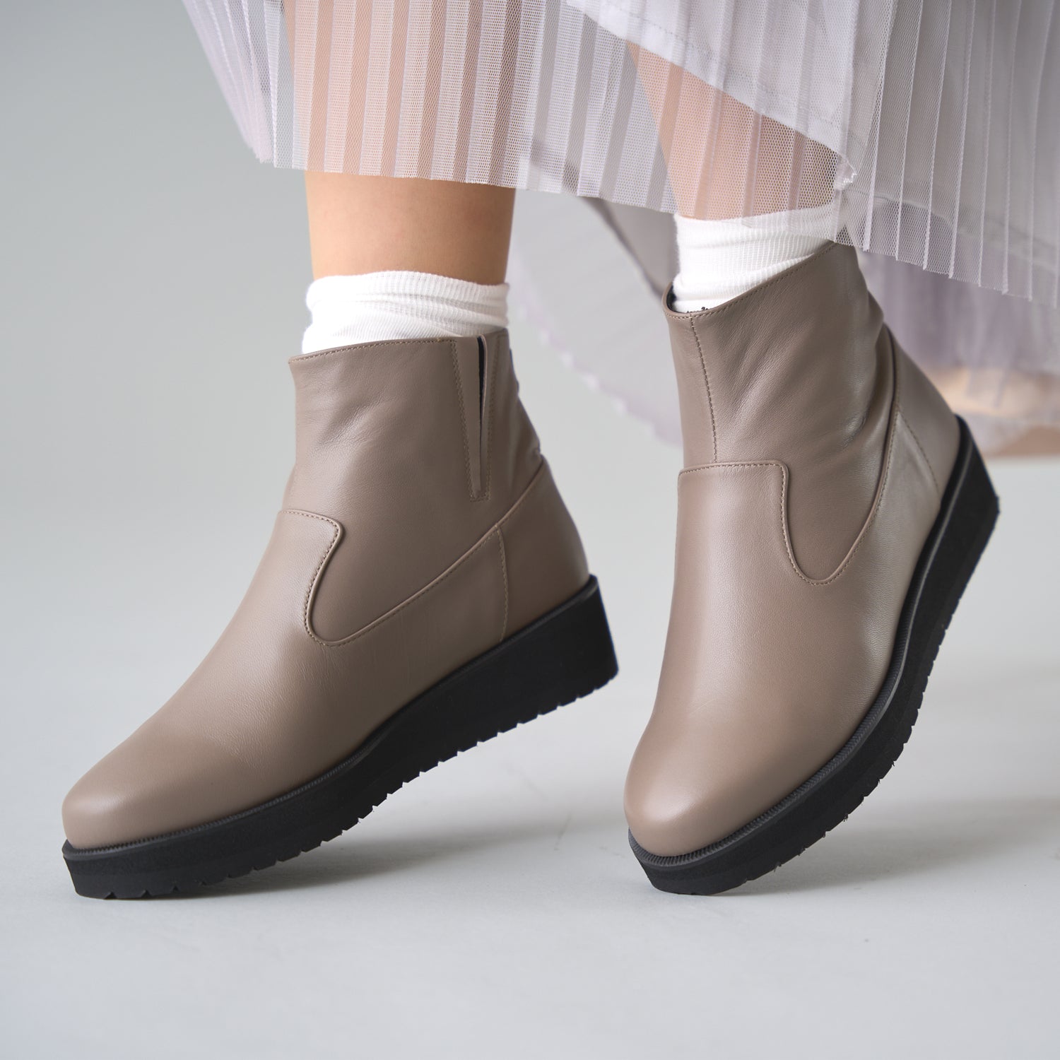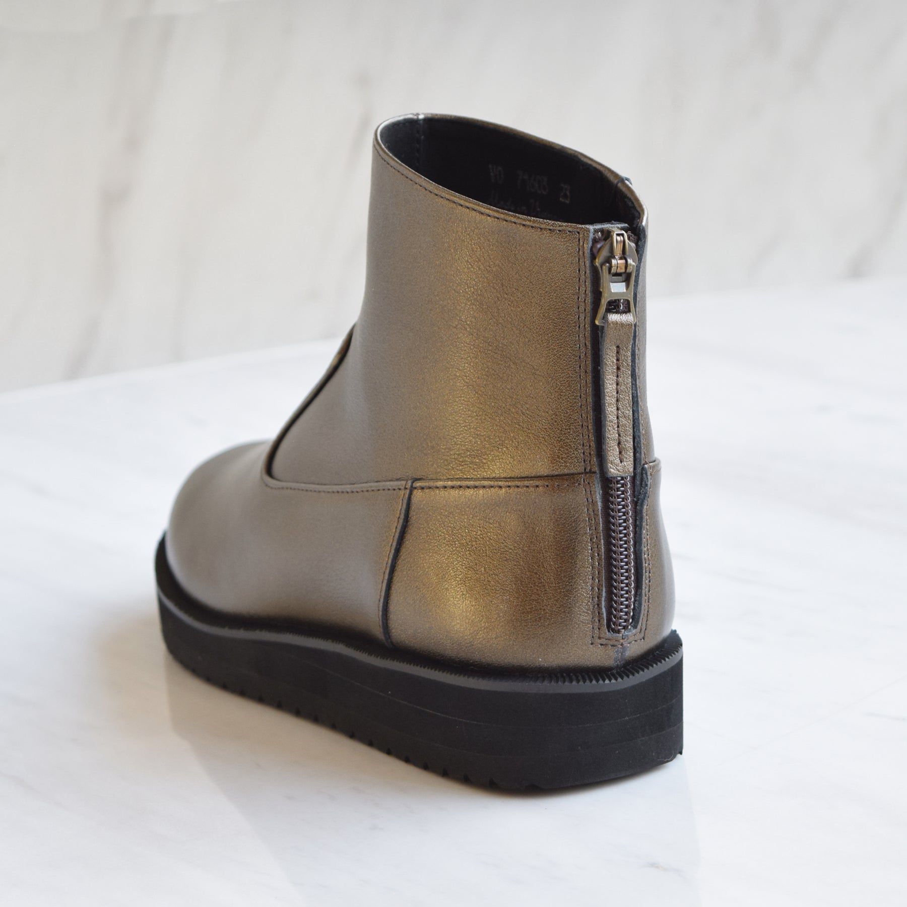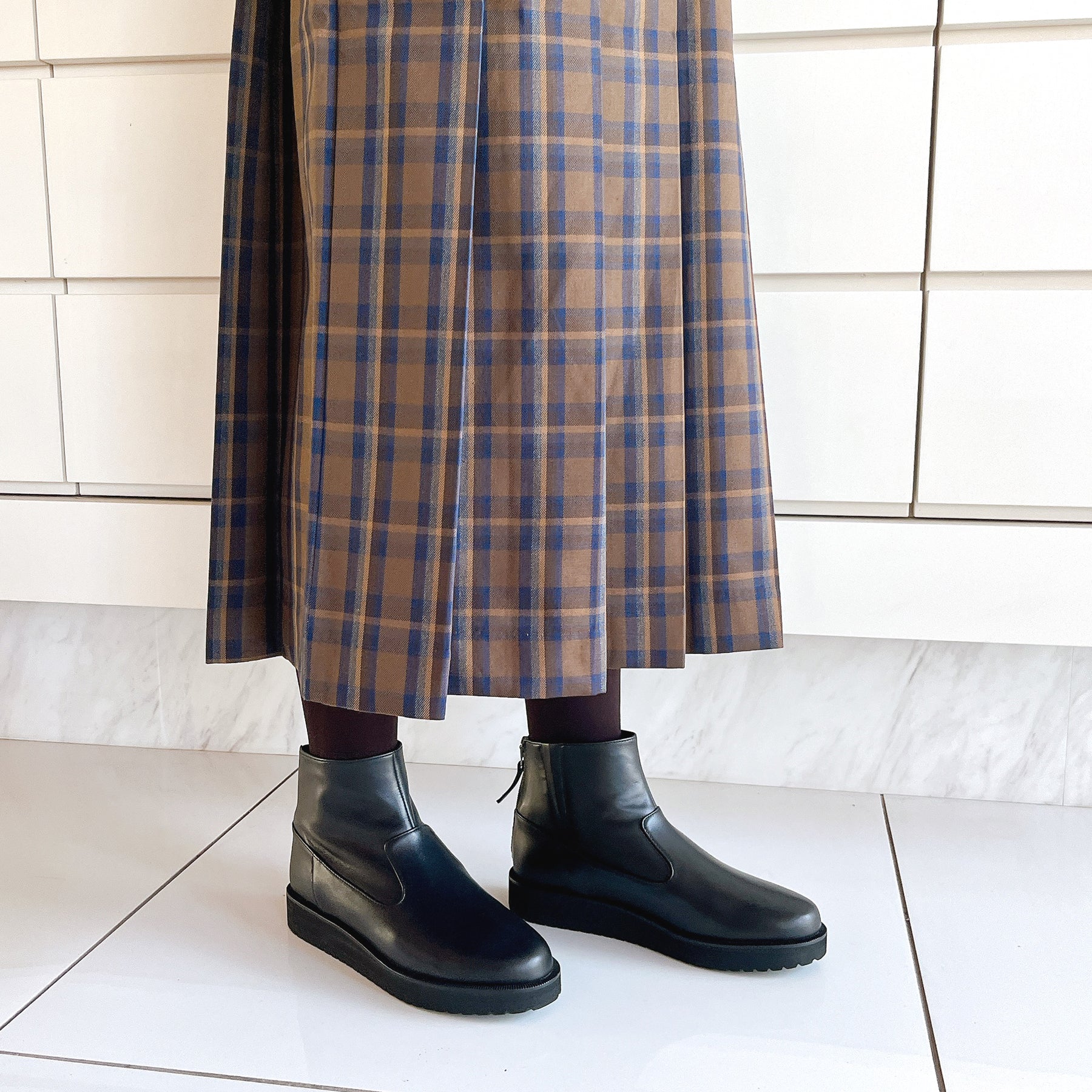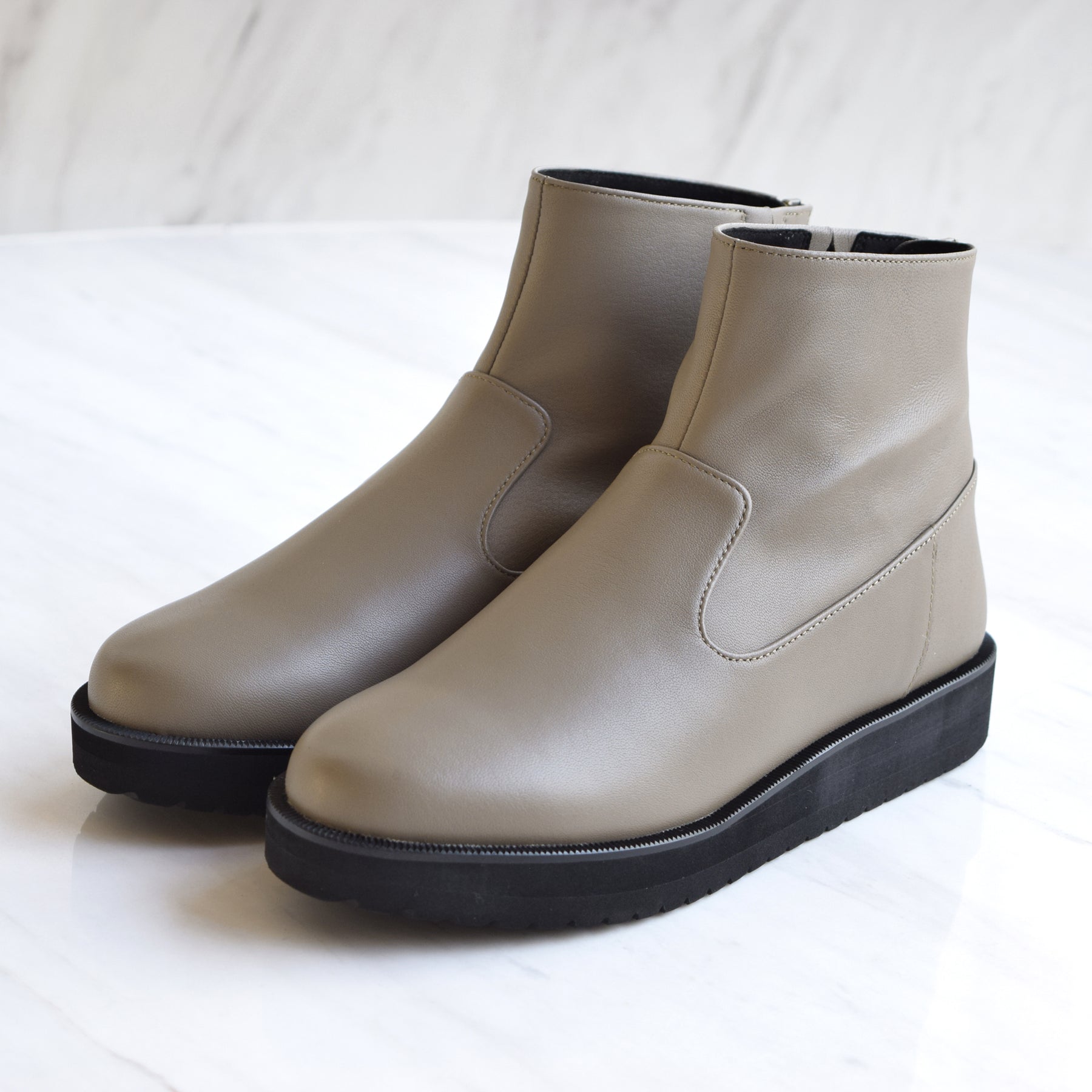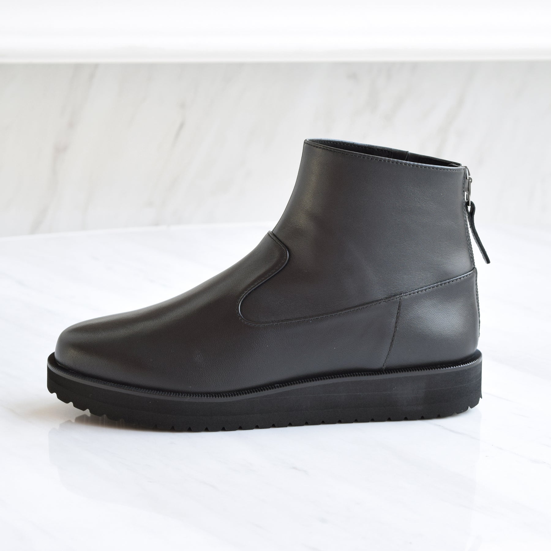 バックジップがポイントのスニーカー底ショートブーツ。内側にはスリットゴムが入っており履き心地も抜群です。アウトソールは軽量でクッション性も高い素材を使用。歩きやすさとスタイルアップを両立させました。GYU-グレージュBL-ブラックBZ-ブロンズ素材:GYU・BL-羊革 BZ-メタリック牛革ヒール高:3㎝(傾斜1cm)筒丈:11㎝