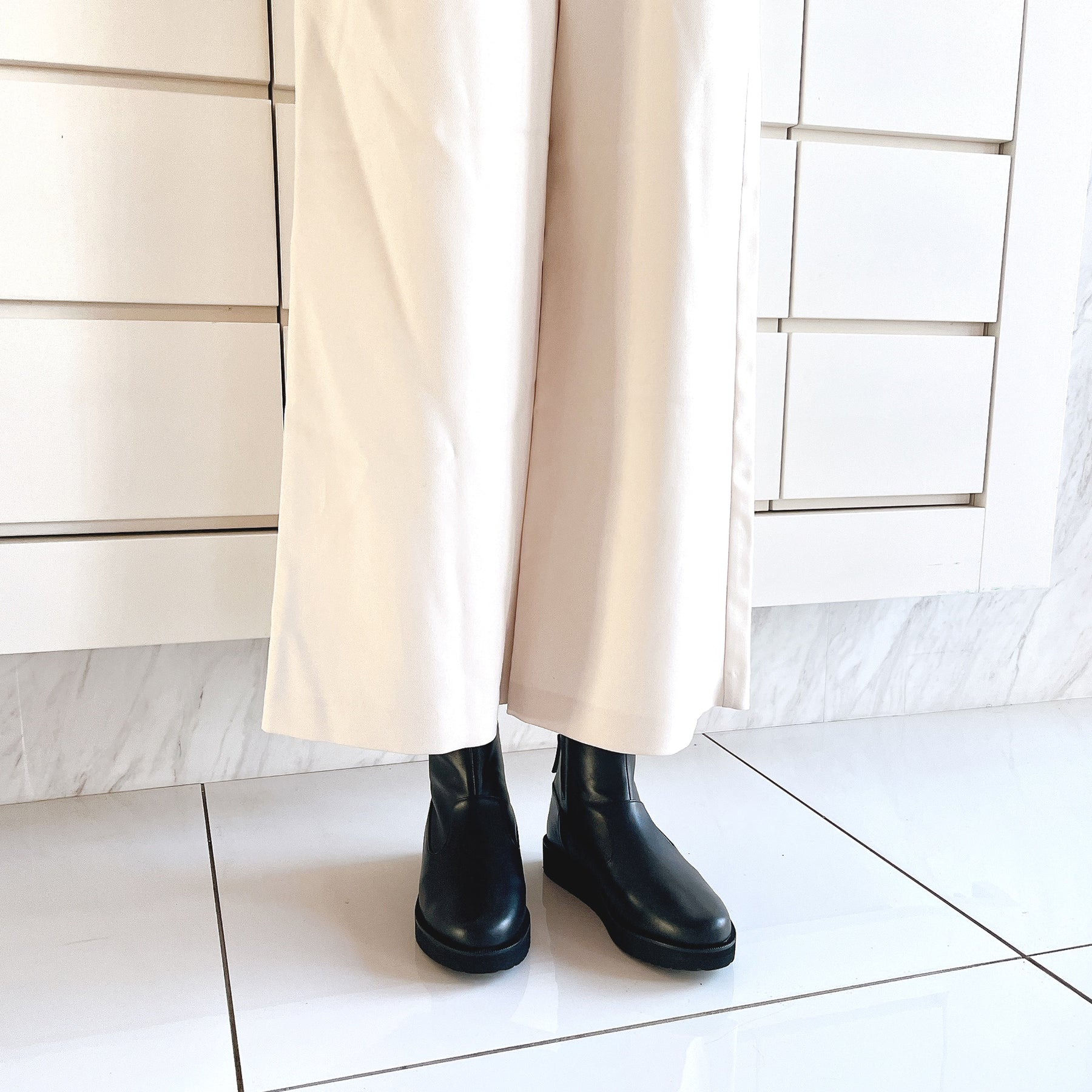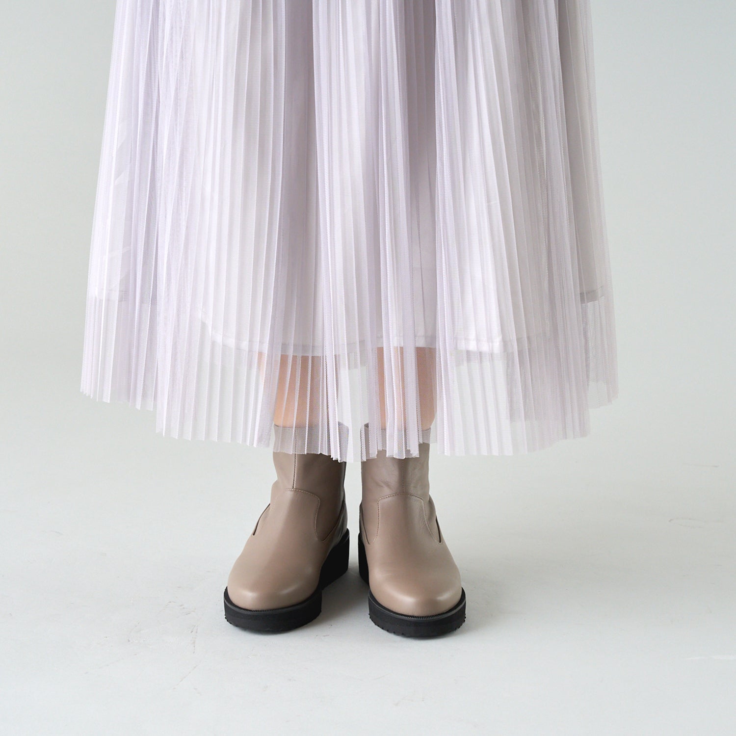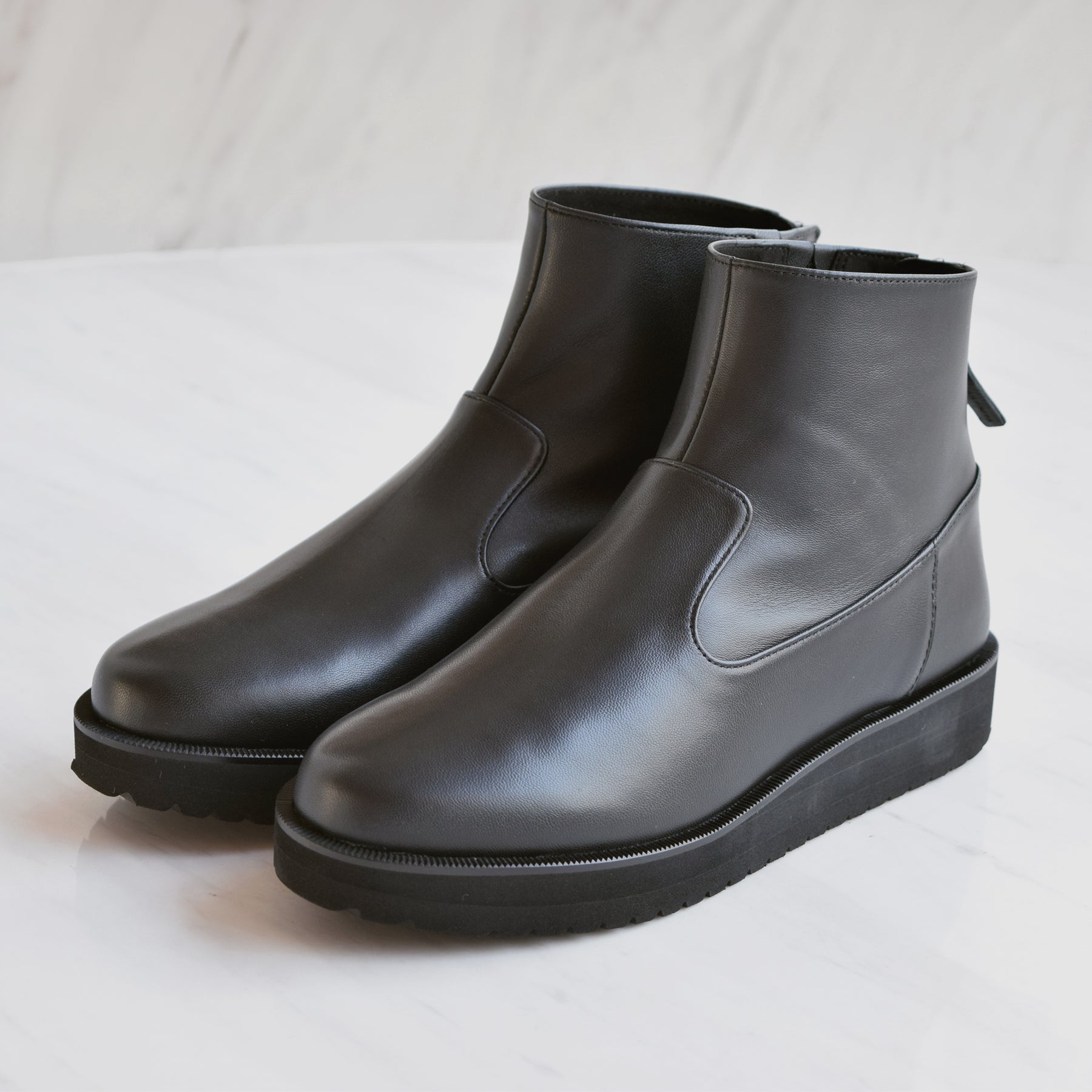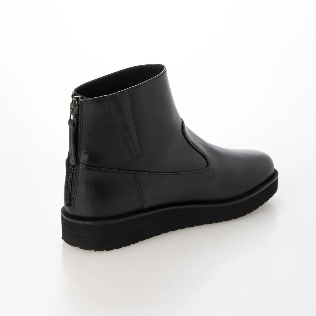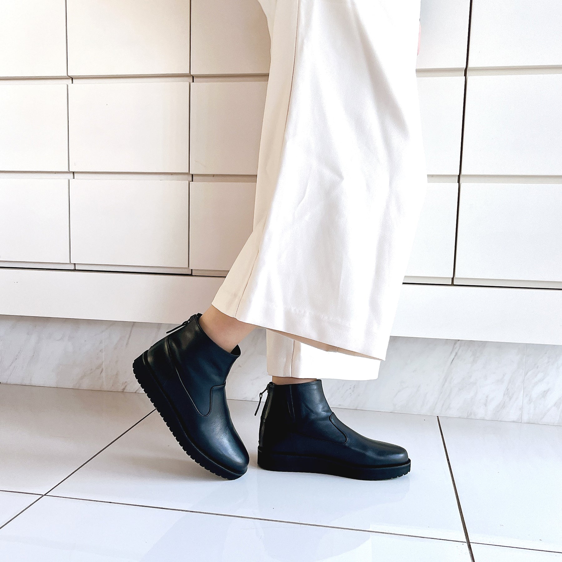 バックジップがポイントのスニーカー底ショートブーツ。内側にはスリットゴムが入っており履き心地も抜群です。アウトソールは軽量でクッション性も高い素材を使用。歩きやすさとスタイルアップを両立させました。GYU-グレージュBL-ブラックBZ-ブロンズ素材:GYU・BL-羊革 BZ-メタリック牛革ヒール高:3㎝(傾斜1cm)筒丈:11㎝