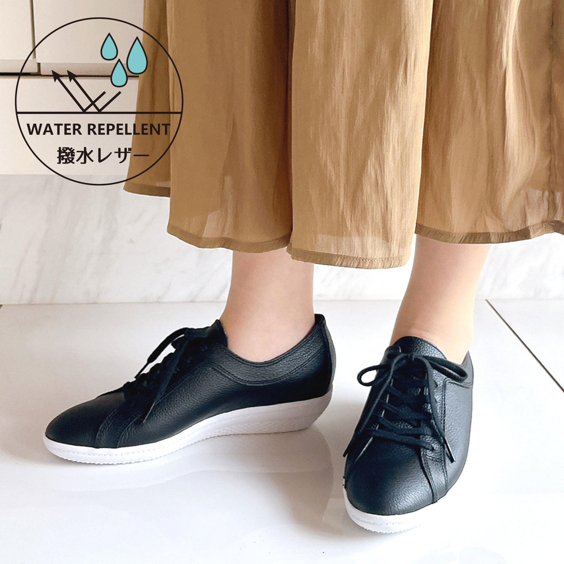撥水・防汚加工のスコッチガードを使用したレザースニーカー。